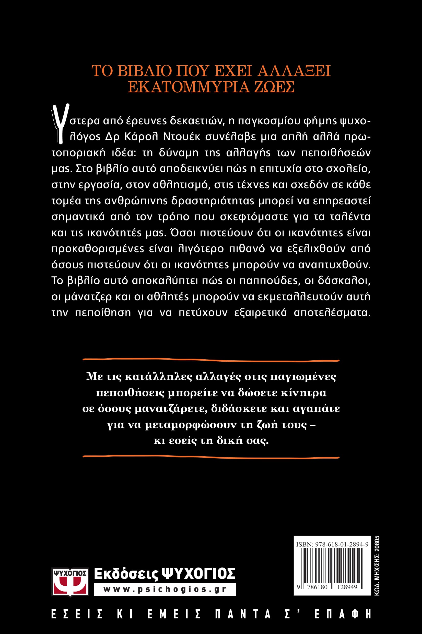 Ύστερα από έρευνες δεκαετιών, η παγκοσμίου φήμης ψυχολόγος Δρ Κάρολ Ντουέκ συνέλαβε μια απλή αλλά πρωτοποριακή ιδέα: τη δύναμη της αλλαγής των πεποιθήσεών μας. Στο βιβλίο αυτό αποδεικνύει πώς η επιτυχία στο σχολείο, στην εργασία, στον αθλητισμό, στις τέχνες και σχεδόν σε κάθε τομέα της ανθρώπινης δραστηριότητας μπορεί να επηρεαστεί σημαντικά από τον τρόπο που σκεφτόμαστε για τα ταλέντα και τις ικανότητές μας. Όσοι πιστεύουν ότι οι ικανότητες είναι προκαθορισμένες είναι λιγότερο πιθανό να εξελιχθούν από όσους πιστεύουν ότι οι ικανότητες μπορούν να αναπτυχθούν. Το βιβλίο αυτό αποκαλύπτει πώς οι παππούδες, οι δάσκαλοι, οι μάνατζερ και οι αθλητές μπορούν να εκμεταλλευτούν αυτή την πεποίθηση για να πετύχουν εξαιρετικά αποτελέσματα.