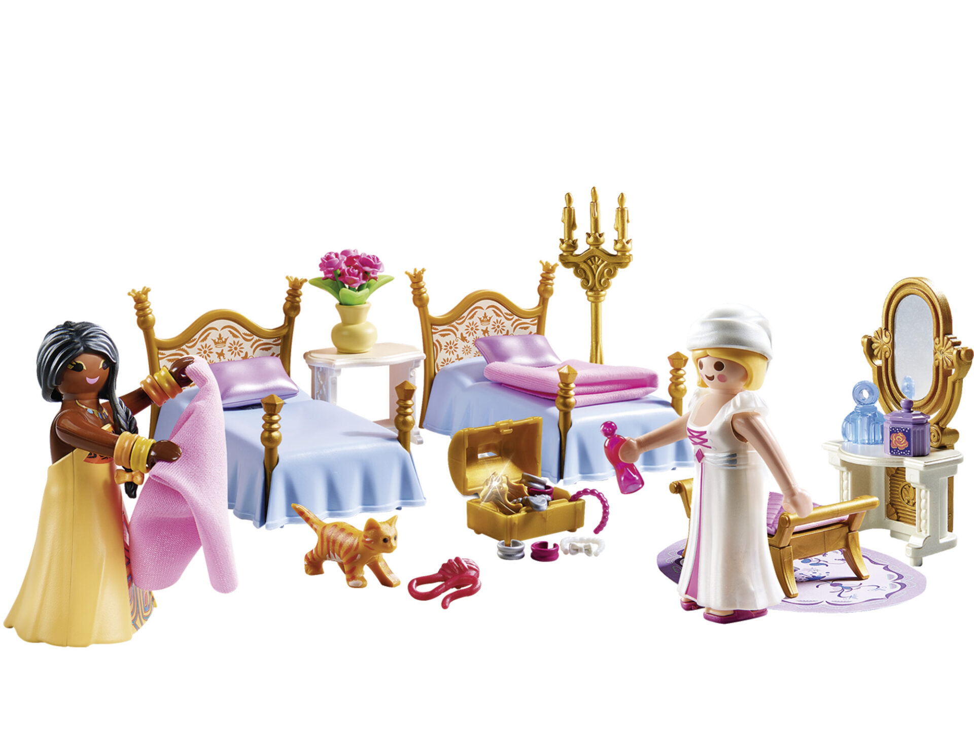 Ώρα για ύπνο! Οι πριγκίπισσες ξεκουράζονται στα άνετα κρεβάτια τους. Περιλ. μπουντουάρ, νυχτικά, κοσμήματα και χαριτωμένα γατάκια.
