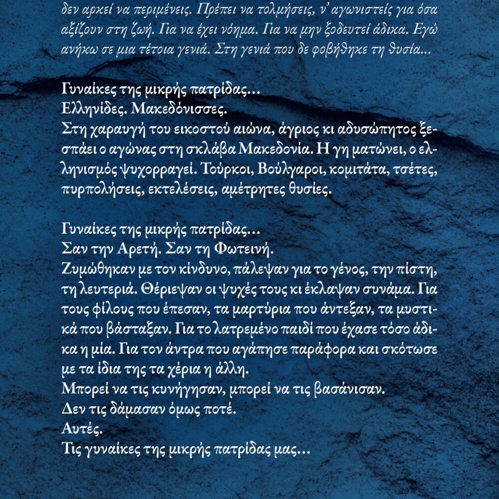 Ζυμώθηκαν με τον κίνδυνο, πάλεψαν για το γένος, την πίστη, τη λευτεριά. Θέριεψαν οι ψυχές τους κι έκλαψαν συνάμα. Για τους φίλους που έπεσαν, τα μαρτύρια που άντεξαν, τα μυστικά που βάσταξαν. Για το λατρεμένο παιδί που έχασε τόσο άδικα η μία. Για τον άντρα που αγάπησε παράφορα και σκότωσε με τα ίδια της τα χέρια η άλλη.