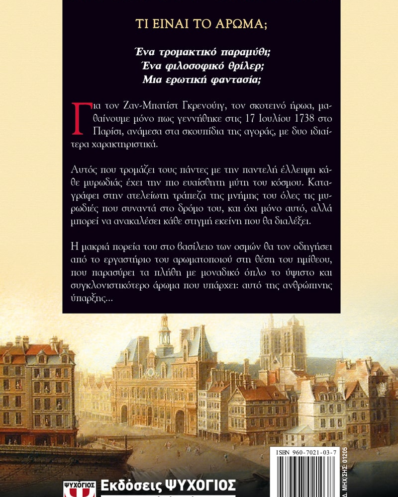 Ένα τρομακτικό παραμύθι; Ένα φιλοσοφικό θρίλερ; Μια ερωτική φαντασία; Για τον Ζαν-Μπατίστ Γκρενούιγ, τον σκοτεινό ήρωα, μαθαίνουμε μόνο πως γεννήθηκε στις 17 Ιουλίου 1738 στο Παρίσι, ανάμεσα στα σκουπίδια της αγοράς με δυο ιδιαίτερα χαρακτηριστικά. Αυτός που τρομάζει τους πάντες με την παντελή έλλειψη κάθε μυρωδιάς έχει την πιο ευαίσθητη μύτη του κόσμου. Καταγράφει στην ατελείωτη τράπεζα της μνήμης του όλες τις μυρωδιές που συναντά στο δρόμο του, και όχι μόνο αυτό, αλλά μπορεί να ανακαλέσει κάθε στιγμή εκείνη που θα διαλέξει. Η μακριά πορεία του στο βασίλειο των οσμών θα τον οδηγήσει από το εργαστήριο του αρωματοποιού στη θέση του ημίθεου που παρασύρει τα πλήθη με μοναδικό όπλο το ύψιστο και συγκλονιστικότερο άρωμα που υπάρχει. Αυτό της ανθρώπινης ύπαρξης.