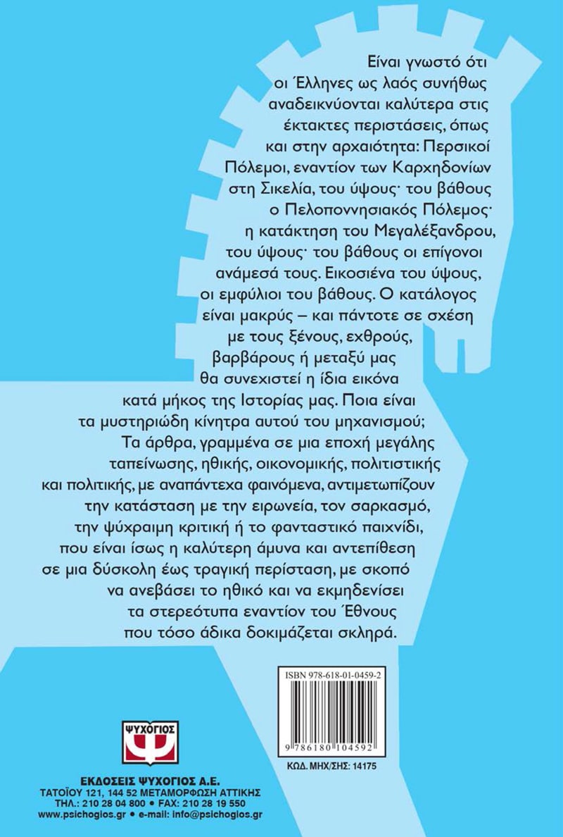 Είναι γνωστό ότι οι Έλληνες ως λαός συνήθως αναδεικνύονται καλύτερα στις έκτακτες περιστάσεις, όπως και στην αρχαιότητα: Περσικοί Πόλεμοι, εναντίον των Καρχηδονίων στη Σικελία, του ύψους· του βάθους ο Πελοποννησιακός Πόλεμος· η κατάκτηση του Μεγαλέξανδρου, του ύψους· του βάθους οι επίγονοι ανάμεσά τους. Εικοσιένα του ύψους, οι εμφύλιοι του βάθους. Ο κατάλογος είναι μακρύς – και πάντοτε σε σχέση με τους ξένους, εχθρούς, βαρβάρους ή μεταξύ μας θα συνεχιστεί η ίδια εικόνα κατά μήκος της Ιστορίας μας. Ποια είναι τα μυστηριώδη κίνητρα αυτού του μηχανισμού; Τα άρθρα, γραμμένα σε μια εποχή μεγάλης ταπείνωσης ηθικής, οικονομικής, πολιτιστικής και πολιτικής, με αναπάντεχα φαινόμενα, αντιμετωπίζουν την κατάσταση με την ειρωνεία, τον σαρκασμό, την ψύχραιμη κριτική ή το φανταστικό παιχνίδι, που είναι ίσως η καλύτερη άμυνα και αντεπίθεση σε μια δύσκολη έως τραγική περίσταση, με σκοπό να ανεβάσει το ηθικό και να εκμηδενίσει τα στερεότυπα εναντίον του Έθνους που τόσο άδικα δοκιμάζεται σκληρά.