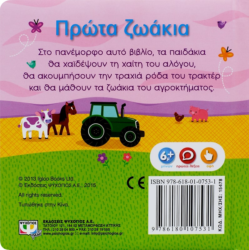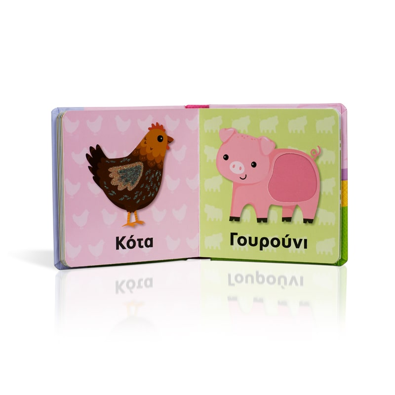 Στο πανέμορφο αυτό βιβλίο, τα παιδάκια θα χαϊδέχουν τη χαίτη του αλόγου, θα ακουμπήσουν την τραχιά ρόδα του τρακτέρ και θα μάθουν τα ζωάκια του αγροκτήματος.