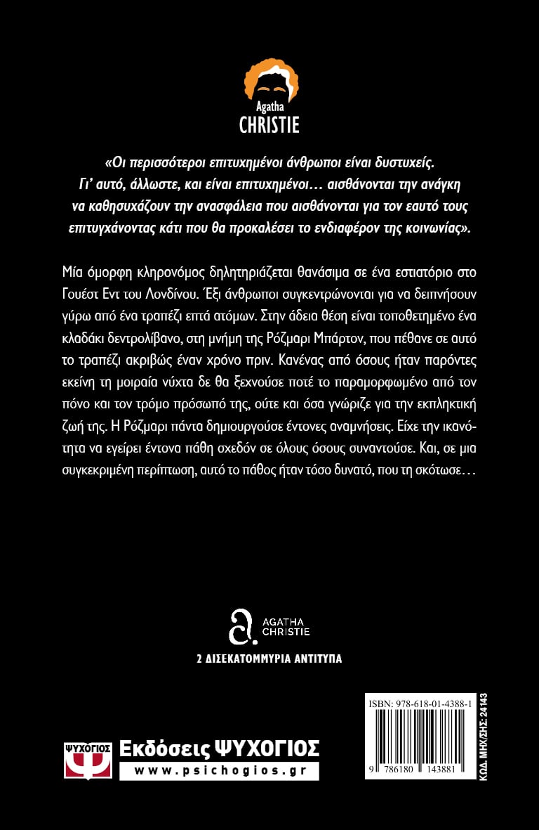 Μία όμορφη κληρονόμος δηλητηριάζεται θανάσιμα σε ένα εστιατόριο στο Γουέστ Εντ του Λονδίνου. Έξι άνθρωποι συγκεντρώνονται για να δειπνήσουν γύρω από ένα τραπέζι επτά ατόμων. Στην άδεια θέση είναι τοποθετημένο ένα κλαδάκι δεντρολίβανο, στη μνήμη της Ρόζμαρι Μπάρτον, που πέθανε σε αυτό το τραπέζι ακριβώς έναν χρόνο πριν. Κανένας από όσους ήταν παρόντες εκείνη τη μοιραία νύχτα δε θα ξεχνούσε ποτέ το παραμορφωμένο από τον πόνο και τον τρόμο πρόσωπό της, ούτε και όσα γνώριζε για την εκπληκτική ζωή της. Η Ρόζμαρι πάντα δημιουργούσε έντονες αναμνήσεις. Είχε την ικανότητα να εγείρει έντονα πάθη σχεδόν σε όλους όσους συναντούσε. Και, σε μια συγκεκριμένη περίπτωση, αυτό το πάθος ήταν τόσο δυνατό, που τη σκότωσε…