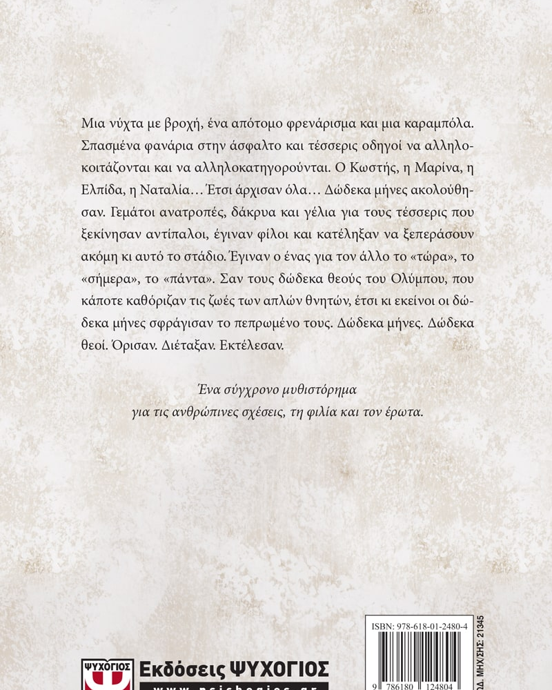 Μια νύχτα με βροχή, ένα απότομο φρενάρισμα και μια καραμπόλα. Σπασμένα φανάρια στην άσφαλτο και τέσσερις οδηγοί να αλληλοκοιτάζονται και να αλληλοκατηγορούνται. Ο Κωστής, η Μαρίνα, η Ελπίδα, η Ναταλία… Έτσι άρχισαν όλα… Δώδεκα μήνες ακολούθησαν. Γεμάτοι ανατροπές, δάκρυα και γέλια για τους τέσσερις που ξεκίνησαν αντίπαλοι, έγιναν φίλοι και κατέληξαν να ξεπεράσουν ακόμη κι αυτό το στάδιο. Έγιναν ο ένας για τον άλλο το «τώρα», το «σήμερα», το «πάντα». Σαν τους δώδεκα θεούς του Ολύμπου, που κάποτε καθόριζαν τις ζωές των απλών θνητών, έτσι κι εκείνοι οι δώδεκα μήνες σφράγισαν το πεπρωμένο τους. Δώδεκα μήνες. Δώδεκα θεοί. Όρισαν. Διέταξαν. Εκτέλεσαν.