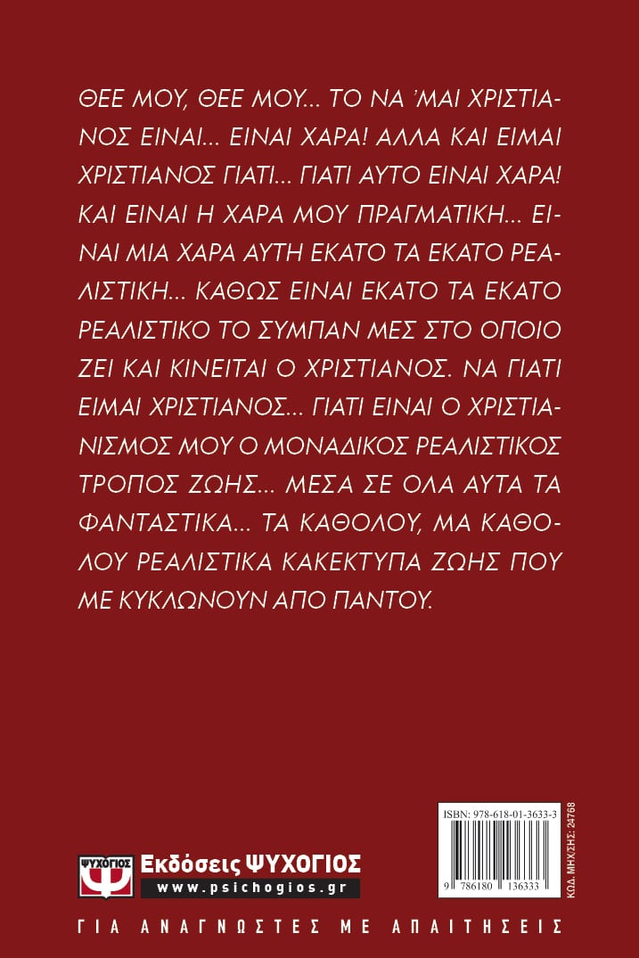 ΘΕΕ ΜΟΥ, ΘΕΕ ΜΟΥ… ΤΟ ΝΑ ’ΜΑΙ ΧΡΙΣΤΙΑΝΟΣ ΕΙΝΑΙ… ΕΙΝΑΙ ΧΑΡΑ! ΑΛΛΑ ΚΑΙ ΕΙΜΑΙ ΧΡΙΣΤΙΑΝΟΣ ΓΙΑΤΙ… ΓΙΑΤΙ ΑΥΤΟ ΕΙΝΑΙ ΧΑΡΑ! ΚΑΙ ΕΙΝΑΙ Η ΧΑΡΑ ΜΟΥ ΠΡΑΓΜΑΤΙΚΗ… ΕΙΝΑΙ ΜΙΑ ΧΑΡΑ ΑΥΤΗ ΕΚΑΤΟ ΤΑ ΕΚΑΤΟ ΡΕΑΛΙΣΤΙΚΗ… ΚΑΘΩΣ ΕΙΝΑΙ ΕΚΑΤΟ ΤΑ ΕΚΑΤΟ ΡΕΑΛΙΣΤΙΚΟ ΤΟ ΣΥΜΠΑΝ ΜΕΣ ΣΤΟ ΟΠΟΙΟ ΖΕΙ ΚΑΙ ΚΙΝΕΙΤΑΙ Ο ΧΡΙΣΤΙΑΝΟΣ. ΝΑ ΓΙΑΤΙ ΕΙΜΑΙ ΧΡΙΣΤΙΑΝΟΣ… ΓΙΑΤΙ ΕΙΝΑΙ Ο ΧΡΙΣΤΙΑΝΙΣΜΟΣ ΜΟΥ Ο ΜΟΝΑΔΙΚΟΣ ΡΕΑΛΙΣΤΙΚΟΣ ΤΡΟΠΟΣ ΖΩΗΣ… ΜΕΣΑ ΣΕ ΟΛΑ ΑΥΤΑ ΤΑ ΦΑΝΤΑΣΤΙΚΑ… ΤΑ ΚΑΘΟΛΟΥ, ΜΑ ΚΑΘΟΛΟΥ ΡΕΑΛΙΣΤΙΚΑ ΚΑΚΕΚΤΥΠΑ ΖΩΗΣ ΠΟΥ ΜΕ ΚΥΚΛΩΝΟΥΝ ΑΠΟ ΠΑΝΤΟΥ.