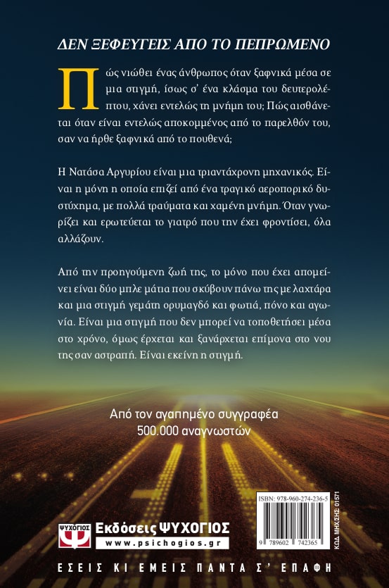 ΔΕΝ ΞΕΦΕΥΓΕΙΣ ΑΠΟ ΤΟ ΠΕΠΡΩΜΕΝΟ Μια πτήση που αρχίζει κανονικά και τελειώνει απρόσμενα είναι η αφορμή να γνωριστούν δυο νέοι άνθρωποι, ο Μάριος και η Νατάσα. Εκείνος είναι γιατρός κι εκείνη η μοναδική επιζήσασα. Ο Μάριος σώζει τη ζωή της νέας κοπέλας και της παραδίδει την καρδιά του. Ο έρωτάς του είναι απελπισμένος, καθώς η Νατάσα μεταφέρεται στο εξωτερικό για ολοκλήρωση της θεραπείας της πριν ο Μάριος προλάβει να μάθει καν το όνομά της. Κι όμως. “ΠΟΤΕ ΜΗ ΛΕΣ ΠΟΤΕ”. Οι δύο νέοι θα ξανασυναντηθούν στο Λονδίνο και η ιστορία τους θα αρχίσει κάτω από τις καλύτερες των προϋποθέσεων. Αλλά, τα πράγματα δεν είναι ρόδινα. Η κοπέλα είναι ένας άνθρωπος χωρίς παρελθόν, με τα ανάλογα προβλήματα, απότοκα του δυστυχήματος. Τα προβλήματα δε σχετίζονται μονάχα με προσωπικές της στιγμές, σχετίζονται και με εργασιακά θέματα και με συμφέροντα εκατοντάδων εκατομμυρίων. Τι θα συμβεί όταν θα έρθει η κρίσιμη στιγμή; Μέχρι τότε, δυο μπλε μάτια, αυτά που έσκυβαν πάνω της με λαχτάρα μέσα στον ορυμαγδό και τον πόνο, φωτίζουν τη ζωή της. Πού θα καταλήξει η σχέση αυτή;