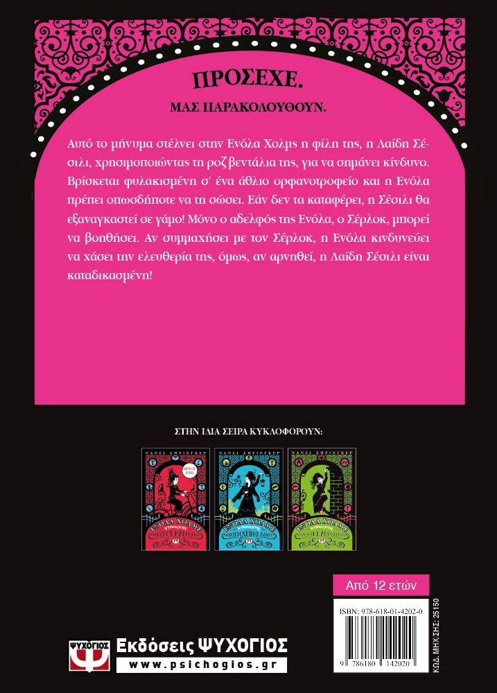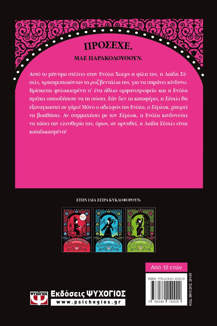Αυτό το μήνυμα στέλνει στην Ενόλα Χολμς η φίλη της, η Λαίδη Σέσιλι, χρησιμοποιώντας τη ροζ βεντάλια της, για να σημάνει κίνδυνο. Βρίσκεται φυλακισμένη σ’ ένα άθλιο ορφανοτροφείο και η Ενόλα πρέπει οπωσδήποτε να τη σώσει. Εάν δεν τα καταφέρει, η Σέσιλι θα εξαναγκαστεί σε γάμο! Μόνο ο αδελφός της Ενόλα, ο Σέρλοκ, μπορεί να βοηθήσει. Αν συμμαχήσει με τον Σέρλοκ, η Ενόλα κινδυνεύει να χάσει την ελευθερία της, όμως αν αρνηθεί, η Λαίδη Σέσιλι είναι καταδικασμένη!