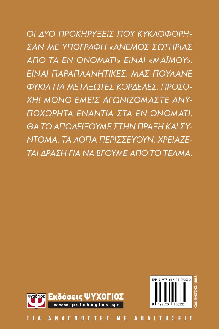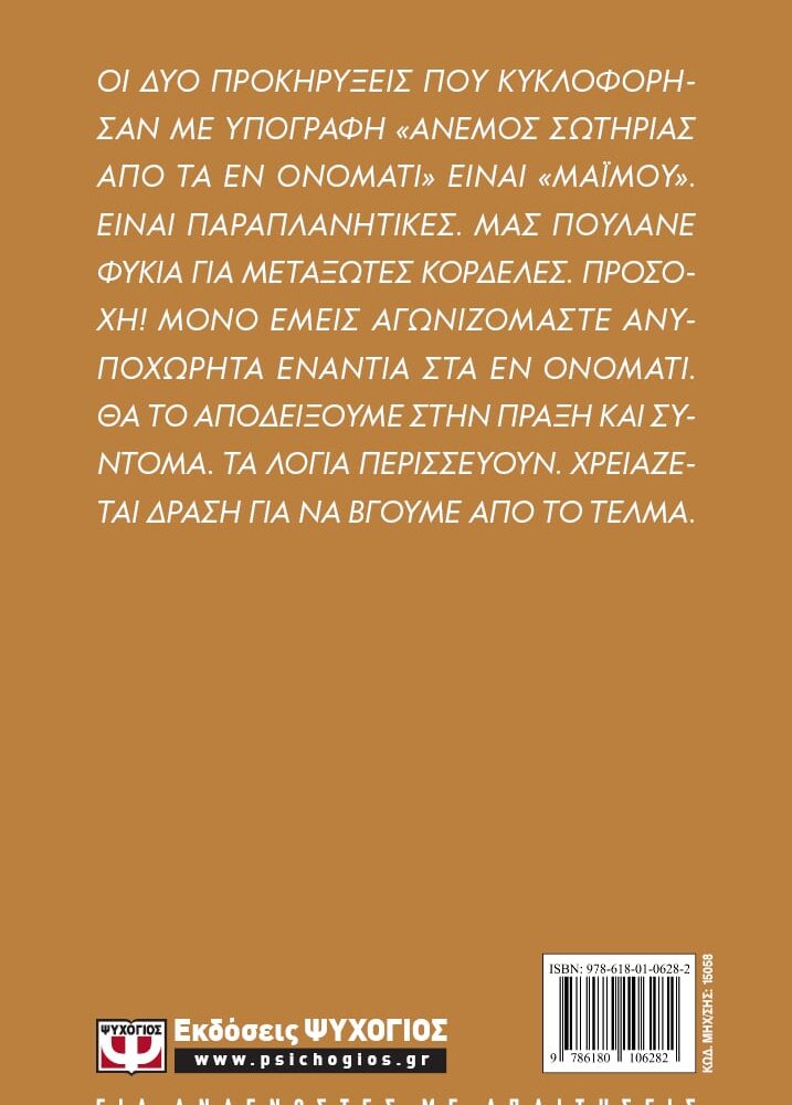 ΟΙ ΔΥΟ ΠΡΟΚΗΡΥΞΕΙΣ ΠΟΥ ΚΥΚΛΟΦΟΡΗΣΑΝ ΜΕ ΥΠΟΓΡΑΦΗ «ΑΝΕΜΟΣ ΣΩΤΗΡΙΑΣ ΑΠΟ ΤΑ ΕΝ ΟΝΟΜΑΤΙ» ΕΙΝΑΙ «ΜΑΪΜΟΥ». ΕΙΝΑΙ ΠΑΡΑΠΛΑΝΗΤΙΚΕΣ. ΜΑΣ ΠΟΥΛΑΝΕ ΦΥΚΙΑ ΓΙΑ ΜΕΤΑΞΩΤΕΣ ΚΟΡΔΕΛΕΣ. ΠΡΟΣΟΧΗ! ΜΟΝΟ ΕΜΕΙΣ ΑΓΩΝΙΖΟΜΑΣΤΕ ΑΝΥΠΟΧΩΡΗΤΑ ΕΝΑΝΤΙΑ ΣΤΑ ΕΝ ΟΝΟΜΑΤΙ. ΘΑ ΤΟ ΑΠΟΔΕΙΞΟΥΜΕ ΣΤΗΝ ΠΡΑΞΗ ΚΑΙ ΣΥΝΤΟΜΑ. ΤΑ ΛΟΓΙΑ ΠΕΡΙΣΣΕΥΟΥΝ. ΧΡΕΙΑΖΕΤΑΙ ΔΡΑΣΗ ΓΙΑ ΝΑ ΒΓΟΥΜΕ ΑΠΟ ΤΟ ΤΕΛΜΑ.