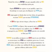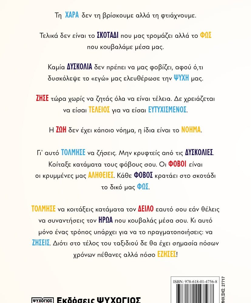 Γι’ αυτό ΤΟΛΜΗΣΕ να ζήσεις. Μην κρυφτείς από τις ΔΥΣΚΟΛΙΕΣ. Κοίταξε κατάματα τους φόβους σου. Οι ΦΟΒΟΙ είναι οι κρυμμένες μας ΑΛΗΘΕΙΕΣ. Κάθε ΦΟΒΟΣ κρατάει στο σκοτάδι το δικό μας ΦΩΣ.