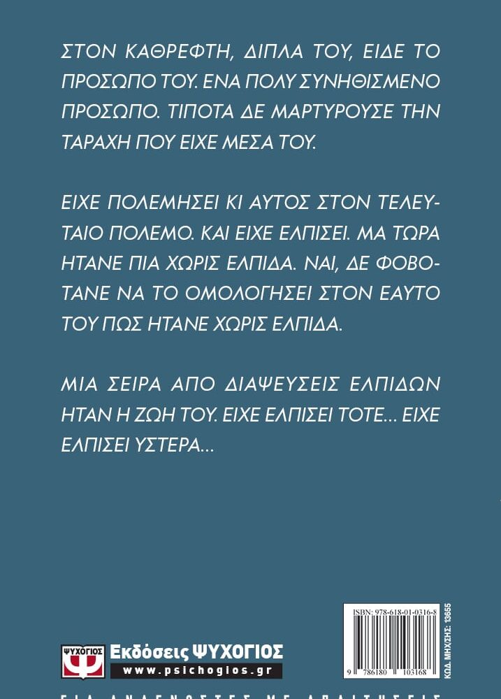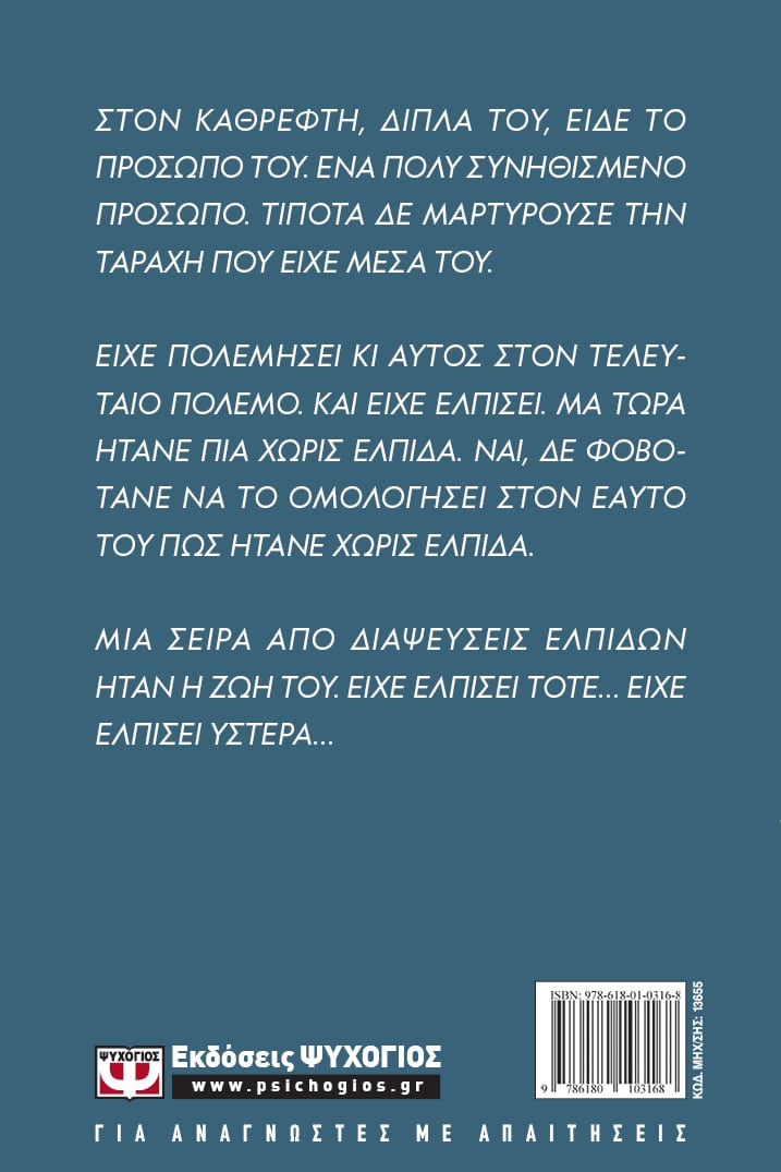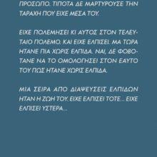 ΕΙΧΕ ΠΟΛΕΜΗΣΕΙ ΚΙ ΑΥΤΟΣ ΣΤΟΝ ΤΕΛΕΥΤΑΙΟ ΠΟΛΕΜΟ. ΚΑΙ ΕΙΧΕ ΕΛΠΙΣΕΙ. ΜΑ ΤΩΡΑ ΗΤΑΝΕ ΠΙΑ ΧΩΡΙΣ ΕΛΠΙΔΑ. ΝΑΙ, ΔΕ ΦΟΒΟΤΑΝΕ ΝΑ ΤΟ ΟΜΟΛΟΓΗΣΕΙ ΣΤΟΝ ΕΑΥΤΟ ΤΟΥ ΠΩΣ ΗΤΑΝΕ ΧΩΡΙΣ ΕΛΠΙΔΑ.