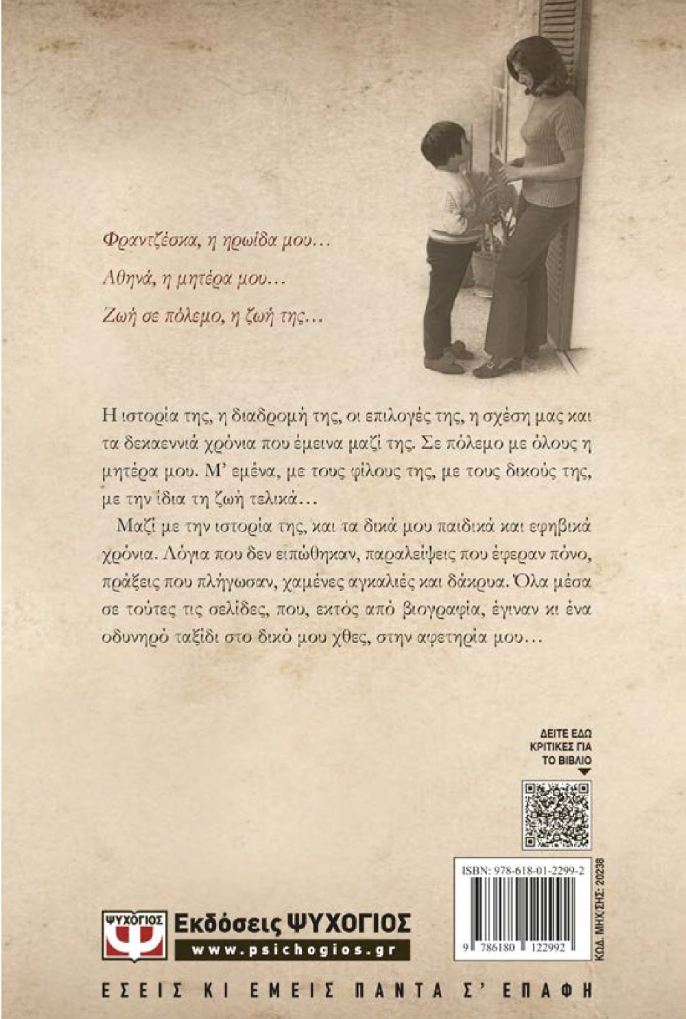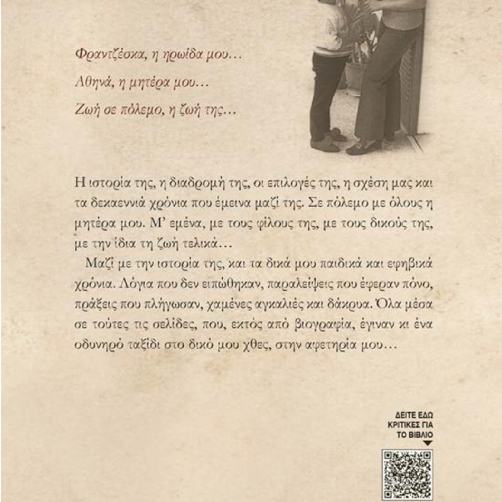 Μαζί με την ιστορία της, και τα δικά μου παιδικά και εφηβικά χρόνια. Λόγια που δεν ειπώθηκαν, παραλείψεις που έφεραν πόνο, πράξεις που πλήγωσαν, χαμένες αγκαλιές και δάκρυα. Όλα μέσα σε τούτες τις σελίδες, που, εκτός από βιογραφία, έγιναν κι ένα οδυνηρό ταξίδι στο δικό μου χθες, στην αφετηρία μου…