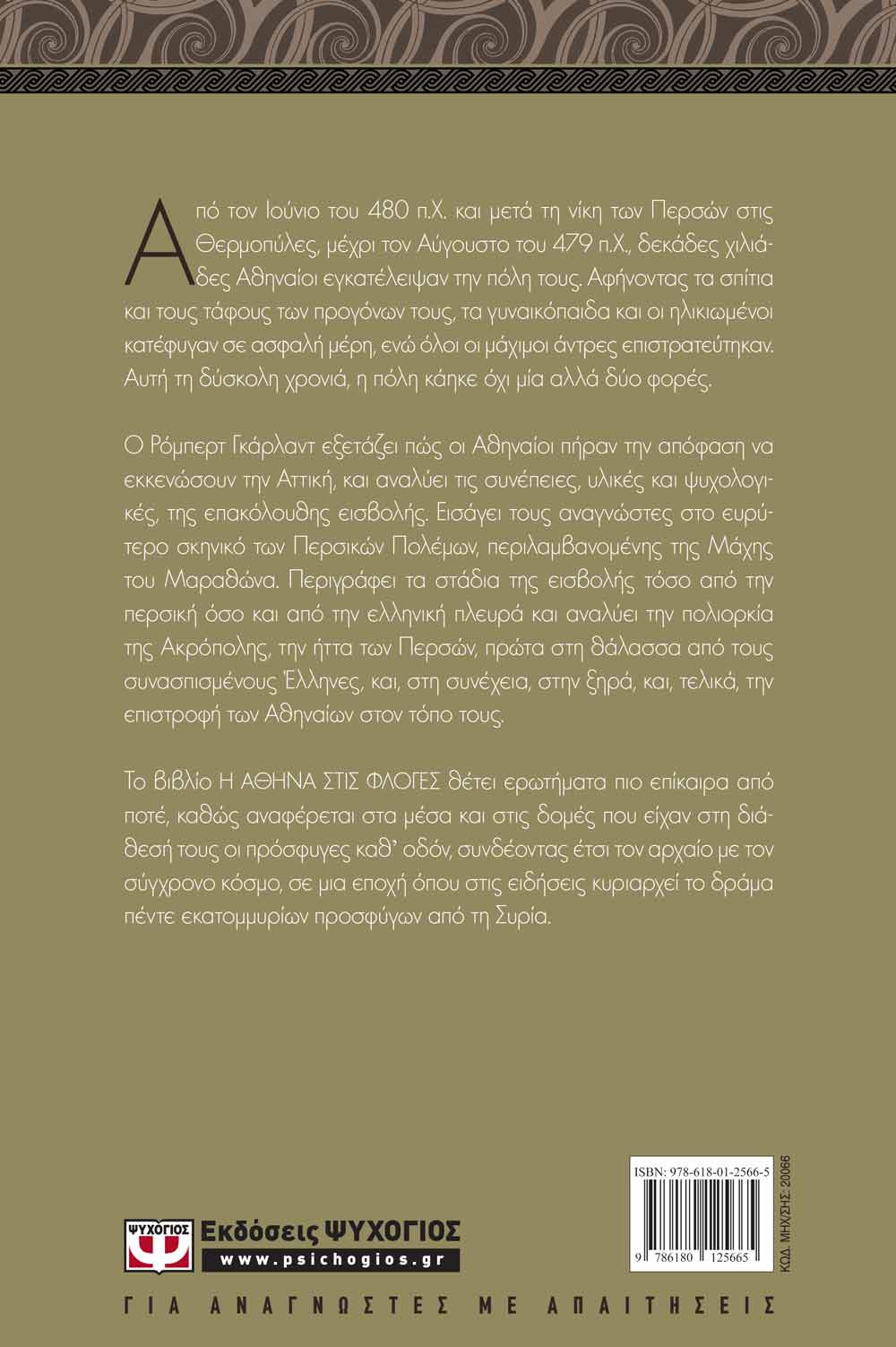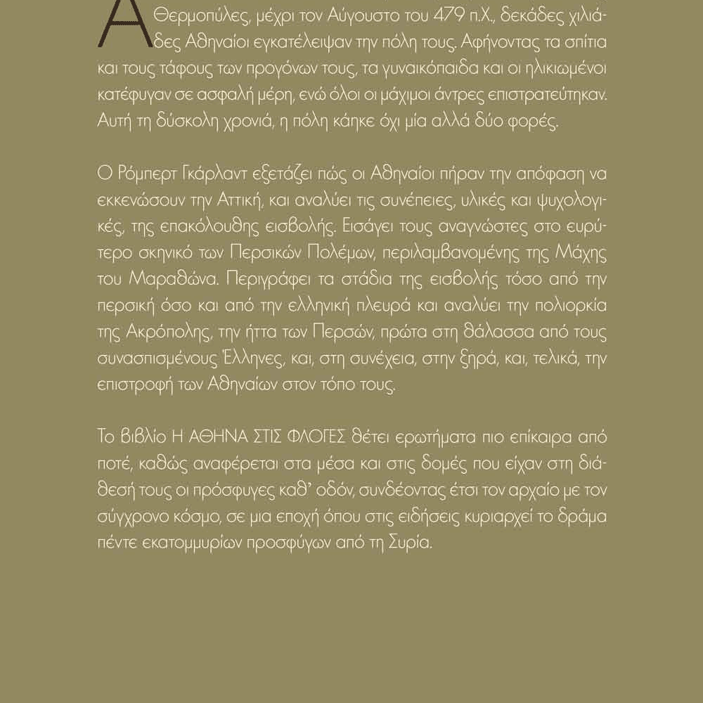 Το βιβλίο Η ΑΘΗΝΑ ΣΤΙΣ ΦΛΟΓΕΣ θέτει ρωτήματα πιο επίκαιρα από ποτέ, καθώς αναφέρεται στα μέσα και στις δομές που είχαν στη διάθεσή τους οι πρόσφυγες καθ’ οδόν, συνδέοντας έτσι τον αρχαίο με τον σύγχρονο κόσμο, σε μια εποχή όπου στις ειδήσεις κυριαρχεί το δράμα πέντε εκατομμυρίων προσφύγων από τη Συρία.