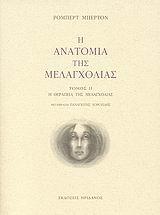 Αν τα τρία από τα τέσσερα βιβλία που πρέπει να διαθέτει ένας Άγγλος είναι η Βίβλος, ο Σαίξπηρ και ο Τσώσερ, το τέταρτο είναι απαραιτήτως "Η ανατομία της μελαγχολίας". Η περιβόητη πραγματεία που έγραψε στα τέλη της Αναγέννησης ο θεολόγος Robert Burton (1577-1640) είναι αφενός μία σπουδή πάνω στη σκοτεινή αρρώστια που σήμερα ονομάζουμε κατάθλιψη, αφετέρου μία μνημειώδης αφήγηση της ανθρώπινης συνθήκης. Παράλληλα συνιστά και ένα απολαυστικό, ψυχαγωγικό ανάγνωσμα, αντίδοτο στην αρρώστια. Είναι, ακόμη, η γραφή ενός ισόβιο αναγνώστη, βιβλίο καμωμένο από βιβλία· τράπεζα της πνευματικής μνήμης, δεξαμενή γνωμών και φθεγμάτων, ανοίγεται εγκυκλοπαιδικά σε κάθε περιοχή του επιστητού, υφαίνοντας έναν γιγάντιο ιστό από αναφορές και πραθέματα (1.598 συγγραφείς δανείζουν τη φωνή τους στο κείμενο), "Η ανατομία της μελαγχολίας" συγκέντρωσε ήδη από την έκδοσή της υπερθετικές και μόνον κρίσεις και απέκτησε φανατικό κοινό, ασκώντας εξάλλου ισχυρή επίδραση σε κορυφαίες προσωπικότητες των γραμμάτων (από τον Μίλτωνα και τον Κητς έως τον Μπέκετ και τον Μπόρχες). Χρειάστηκε να περάσουν σχεδόν τέσσερις αιώνες μέχρι το "απόκρυφο" αυτό αριστούργημα να αποκαλυφθεί και στον μη αγγλόφωνο αναγνώστη. Στα ελληνικά παραδίδεται για πρώτη φορά.Ο ανά χείρας δεύτερος τόμος -ύστερα από τα αίτια, τα συμπτώματα και τις προγνώσεις που επισκοπούνται στο πρώτο μέρος-, εστιάζεται στη θεραπεία της μελαγχολίας, καθώς ο συγγραφέας καταφεύγει σε κάθε ιαματικό μέσο (φιλοσοφική παραμυθία, διαιτητική, ιατρικές συστάσεις, βότανα κ.ά.), για να απαλύνει τη δοκιμασία στην ψυχή και στο σώμα. Το έργο συμπληρώνει ο επικείμενος τρίτος τόμος, που με ξεχωριστή έμπνευση μελετά το θέμα της ερωτικής και της θρησκευτικής μελαγχολίας.