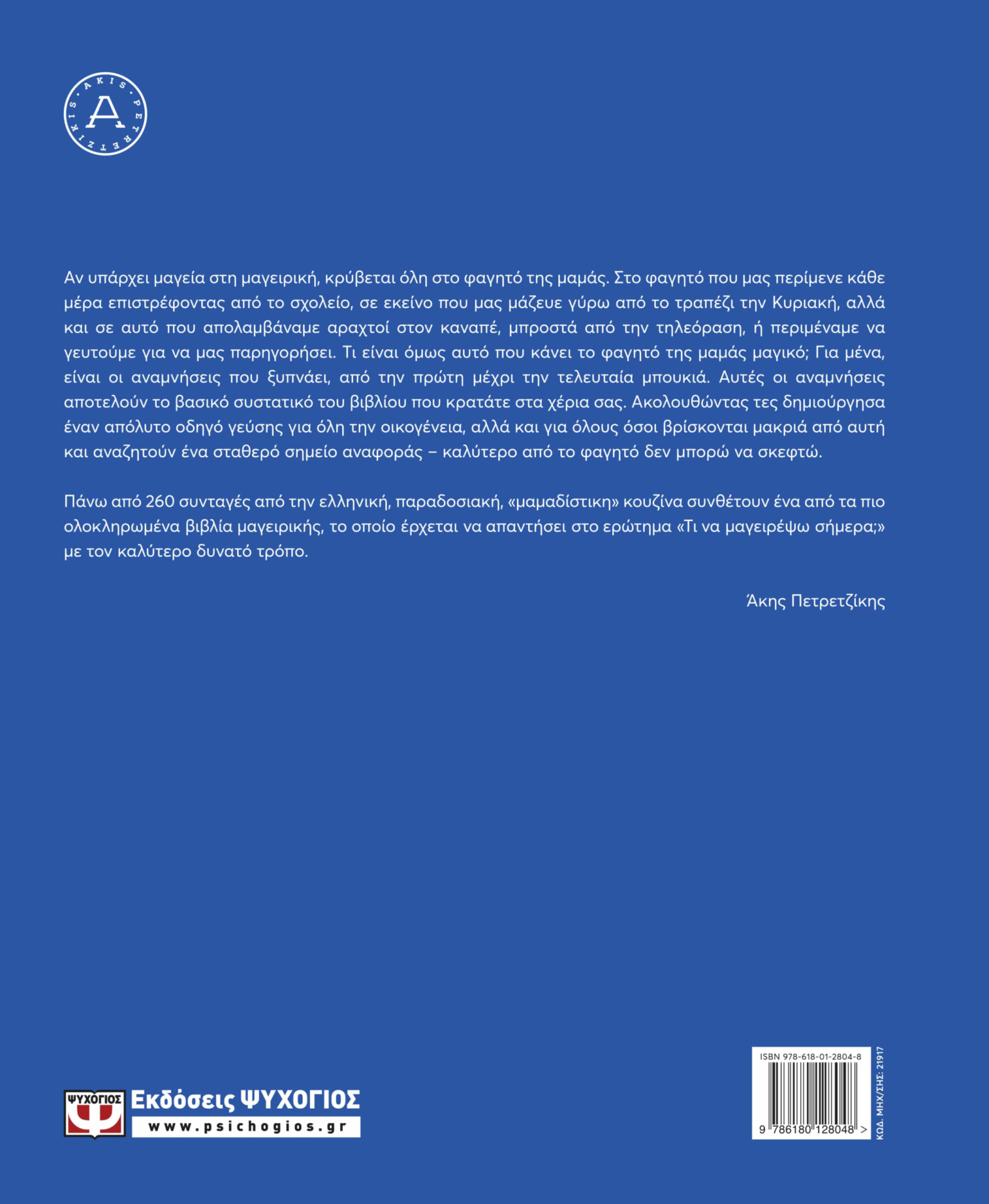Πάνω από 260 συνταγές από την ελληνική, παραδοσιακή, «μαμαδίστικη» κουζίνα συνθέτουν ένα από τα πιο ολοκληρωμένα βιβλία μαγειρικής, το οποίο έρχεται να απαντήσει στο ερώτημα «Τι να μαγειρέψω σήμερα;» με τον καλύτερο δυνατό τρόπο.