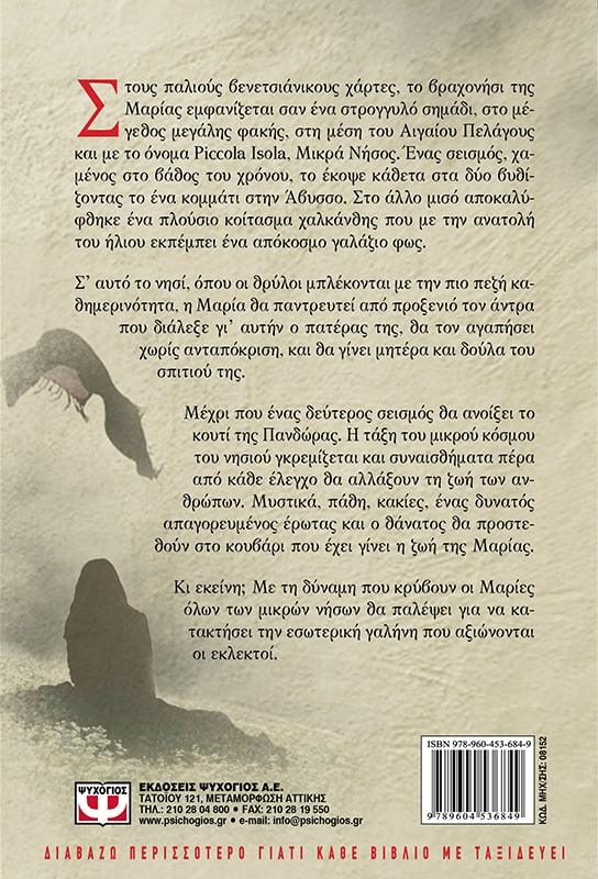 Στους παλιούς βενετσιάνικους χάρτες, το βραχονήσι της Μαρίας εμφανίζεται σαν ένα στρογγυλό σημάδι, στο μέγεθος μεγάλης φακής, στη μέση του Αιγαίου Πελάγους και με το όνομα Piccola Isola, Μικρά Νήσος. Ένας σεισμός, χαμένος στο βάθος του χρόνου, το έκοψε κάθετα στα δύο βυθίζοντας το ένα κομμάτι στην Άβυσσο. Στο άλλο μισό αποκαλύφθηκε ένα πλούσιο κοίτασμα χαλκάνθης που με την ανατολή του ήλιο εκπέμπει ένα απόκοσμο γαλάζιο φως. Σ’ αυτό το νησί, όπου οι θρύλοι μπλέκονται με την πιο πεζή καθημερινότητα, η Μαρία θα παντρευτεί από προξενιό τον άντρα που διάλεξε γι’ αυτήν ο πατέρας της, θα τον αγαπήσει χωρίς ανταπόκριση, και θα γίνει μητέρα και δούλα του σπιτιού της. Μέχρι που ένας δεύτερος σεισμός θα ανοίξει το κουτί της Πανδώρας. Η τάξη του μικρού κόσμου του νησιού γκρεμίζεται και συναισθήματα πέρα από κάθε έλεγχο θα αλλάξουν τη ζωή των ανθρώπων. Μυστικά, πάθη, κακίες, ένας δυνατός απαγορευμένος έρωτας και ο θάνατος θα προστεθούν στο κουβάρι που έχει γίνει η ζωή της Μαρίας. Κι εκείνη; Με τη δύναμη που κρύβουν οι Μαρίες όλων των μικρών νήσων θα παλέψει για να κατακτήσει την εσωτερική γαλήνη που αξιώνονται οι εκλεκτοί.