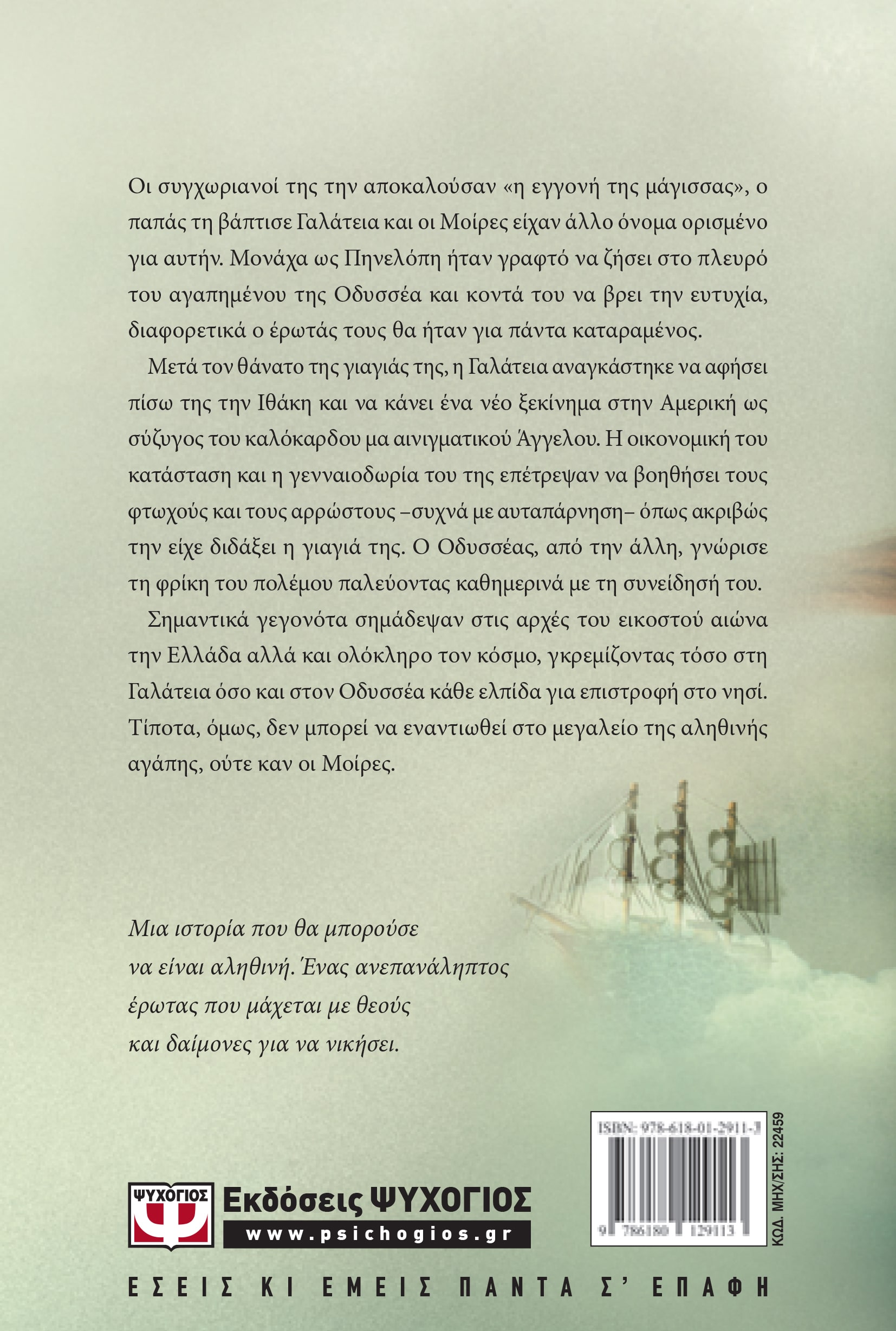 Οι συγχωριανοί της την αποκαλούσαν «η εγγονή της μάγισσας», ο παπάς τη βάπτισε Γαλάτεια και οι Μοίρες είχαν άλλο όνομα ορισμένο για αυτήν. Μονάχα ως Πηνελόπη ήταν γραφτό να ζήσει στο πλευρό του αγαπημένου της Οδυσσέα και κοντά του να βρει την ευτυχία, διαφορετικά ο έρωτάς τους θα ήταν για πάντα καταραμένος.