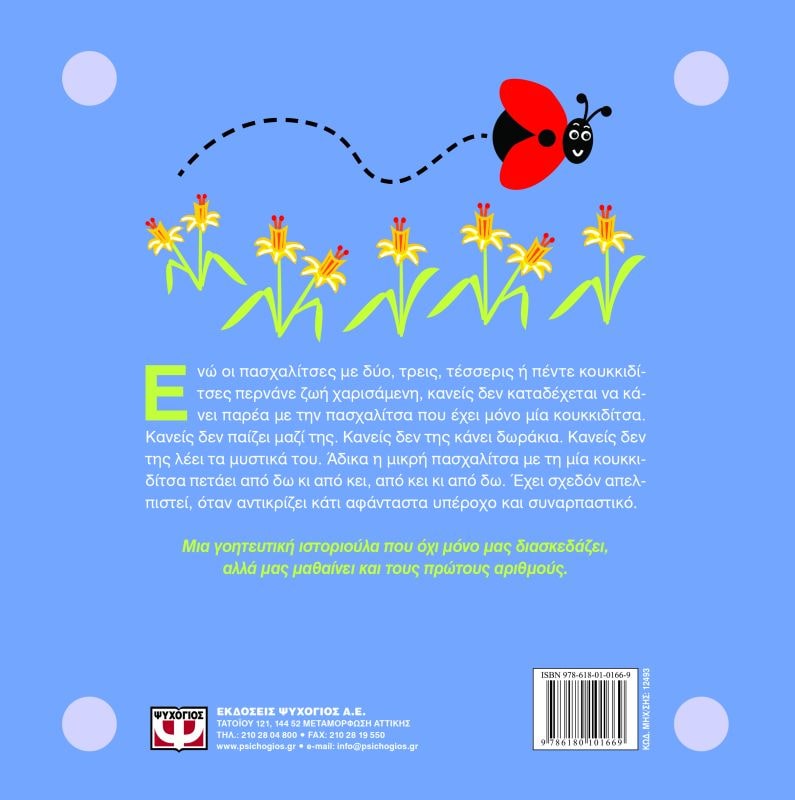 Ενώ οι πασχαλίτσες µε δύο, τρεις, τέσσερις ή πέντε κουκκιδίτσες περνάνε ζωή χαρισάµενη, κανείς δεν καταδέχεται να κάνει παρέα µε την πασχαλίτσα που έχει µόνο µία κουκκιδίτσα. Κανείς δεν παίζει μαζί της. Κανείς δεν της κάνει δωράκια. Κανείς δεν της λέει τα μυστικά του. Άδικα η µικρή πασχαλίτσα µε τη µία µόνο κουκκιδίτσα πετάει από δω κι από κει, κι από κει κι από δω. Έχει σχεδόν απελπιστεί, όταν αντικρίζει κάτι αφάνταστα υπέροχο και συναρπαστικό.