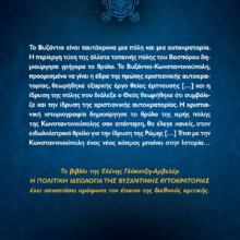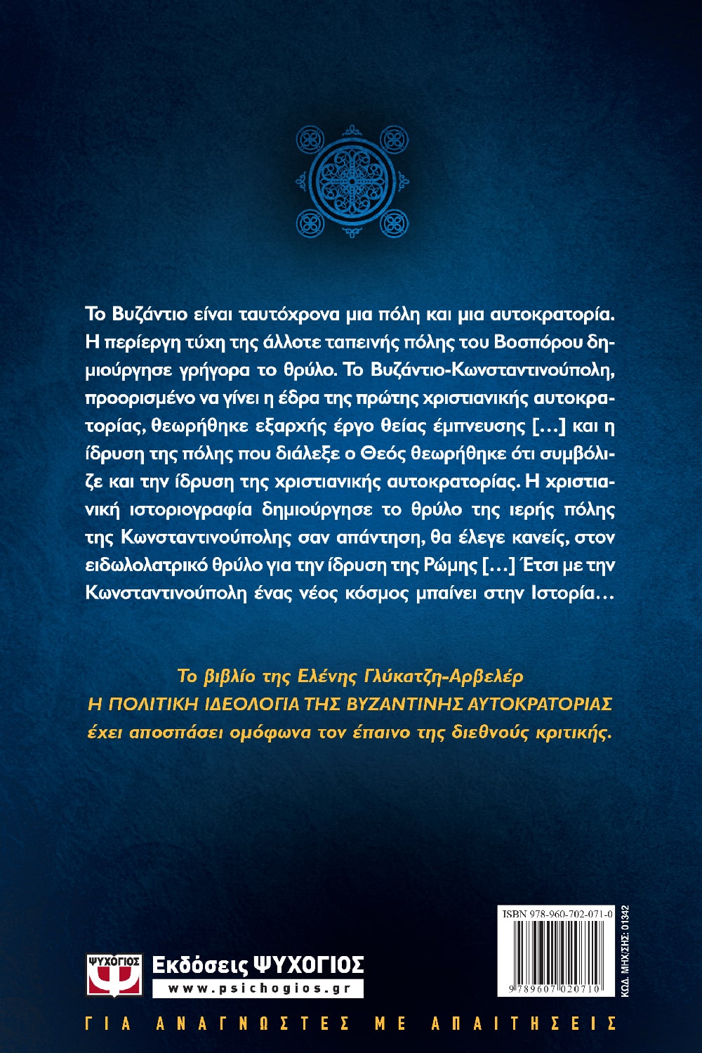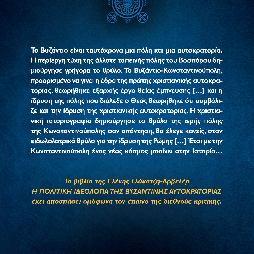 Το Βυζάντιο είναι ταυτόχρονα μια πόλη και μια αυτοκρατορία. Η περίεργη τύχη τής άλλοτε ταπεινής πόλης του Βοσπόρου δημιούργησε γρήγορα το θρύλο. Το Βυζάντιο-Κωνσταντινούπολη, προορισμένο να γίνει η έδρα της πρώτης χριστιανικής αυτοκρατορίας, θεωρήθηκε εξαρχής έργο θείας έμπνευσης […] και η ίδρυση της πόλης που διάλεξε ο Θεός θεωρήθηκε ότι συμβόλιζε και την ίδρυση της χριστιανικής αυτοκρατορίας. Η χριστιανική ιστοριογραφία δημιούργησε το θρύλο της ιερής πόλης της Κωνσταντινούπολης σαν απάντηση θα έλεγε κανείς στον ειδωλολατρικό θρύλο για την ίδρυση της Ρώμης […] Έτσι με την Κωνσταντινούπολη ένας νέος κόσμος μπαίνει στην Ιστορία… Το βιβλίο της Ελένης Γλύκατζη-Αρβελέρ Η πολιτική ιδεολογία της Βυζαντινής Αυτοκρατορίας έχει αποσπάσει ομόφωνα τον έπαινο της διεθνούς κριτικής. “Θα έπρεπε να αποτελεί αναπόσπαστο βοήθημα κάθε φοιτητού της ελληνικής ιστορίας και κάθε ανθρώπου που προβληματίζεται για την νεοελληνική ιστορία και πολιτισμό”, έγραφε το ΒΗΜΑ στις 18/4/1976. Και με την ίδια πεποίθηση το προσφέρουμε σήμερα με υπερηφάνεια στο ελληνικό κοινό.