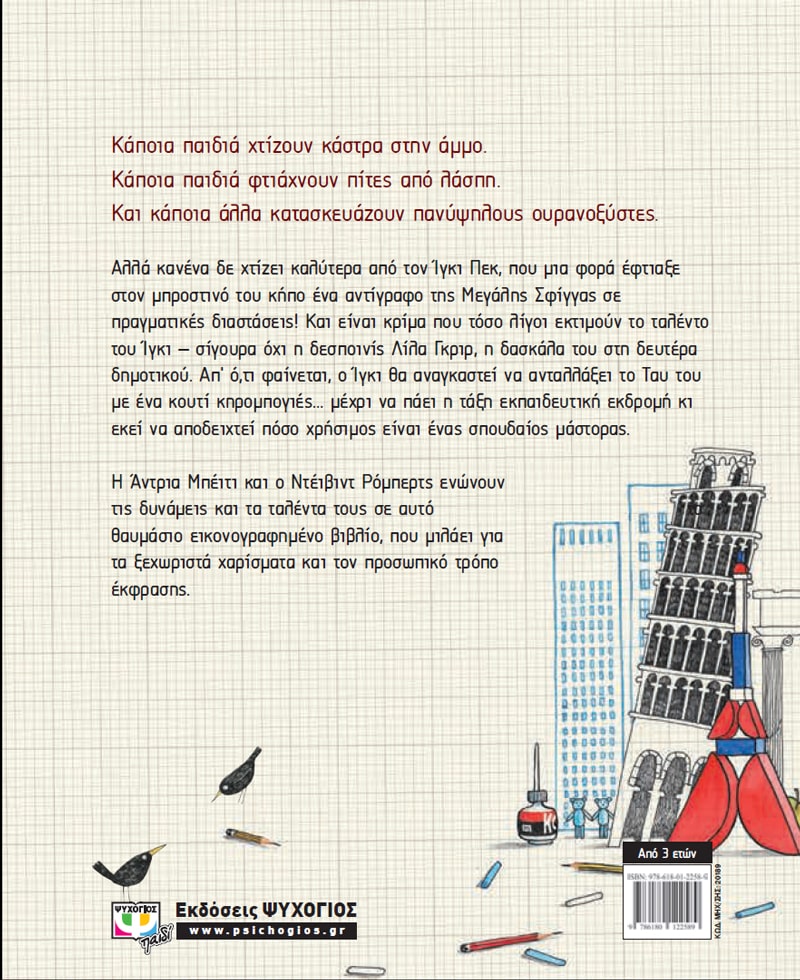 Αλλά κανένα δε χτίζει καλύτερα από τον Ίγκι Πεκ, που μια φορά έφτιαξε στον μπροστινό του κήπο ένα αντίγραφο της Μεγάλης Σφίγγας σε πραγματικές διαστάσεις! Και είναι κρίμα που τόσο λίγοι εκτιμούν το ταλέντο του Ίγκι – σίγουρα όχι η δεσποινίς Λίλα Γκριρ, η δασκάλα στη δευτέρα δημοτικού. Απ’ ό,τι φαίνεται, ο Ίγκι θα αναγκαστεί να ανταλλάξει το Ταυ του με ένα κουτί κηρομπογιές… μέχρι να πάει η τάξη εκπαιδευτική εκδρομή κι εκεί να αποδειχτεί πόσο χρήσιμος είναι ένας σπουδαίος μάστορας.