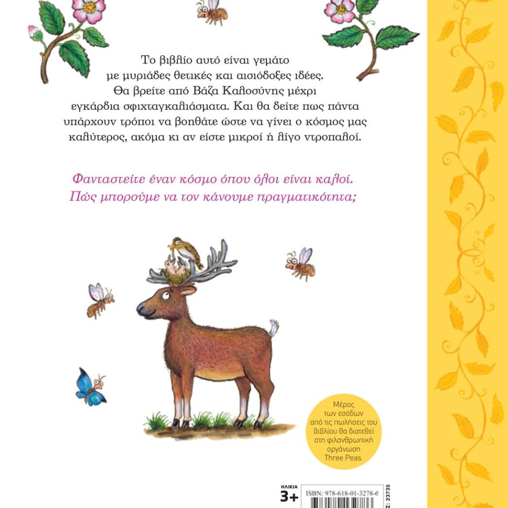 Το βιβλίο αυτό είναι γεμάτο με μυριάδες θετικές και αισιόδοξες ιδέες. Θα βρείτε από Βάζα Καλοσύνης μέχρι εγκάρδια σφιχταγκαλιάσματα. Και θα δείτε πως πάντα υπάρχουν τρόποι να βοηθάτε ώστε να γίνει ο κόσμος μας καλύτερος, ακόμα κι αν είστε μικροί ή λίγο ντροπαλοί.