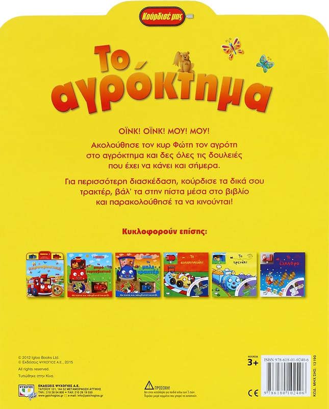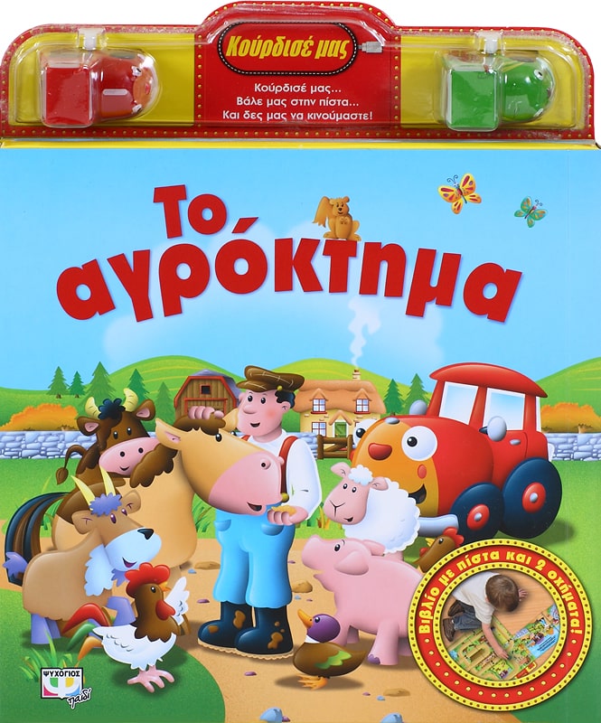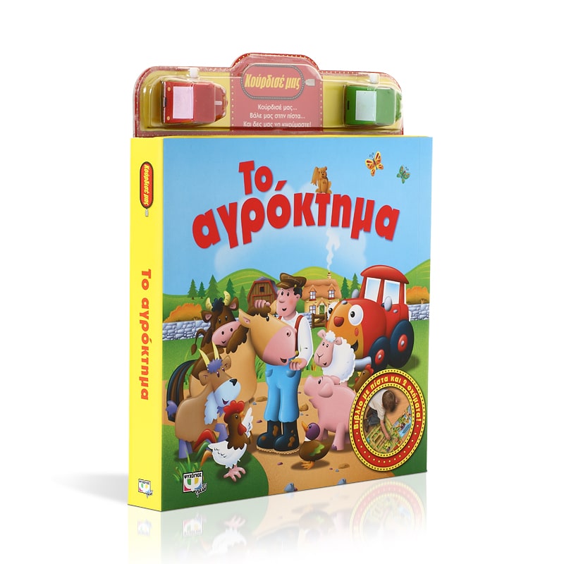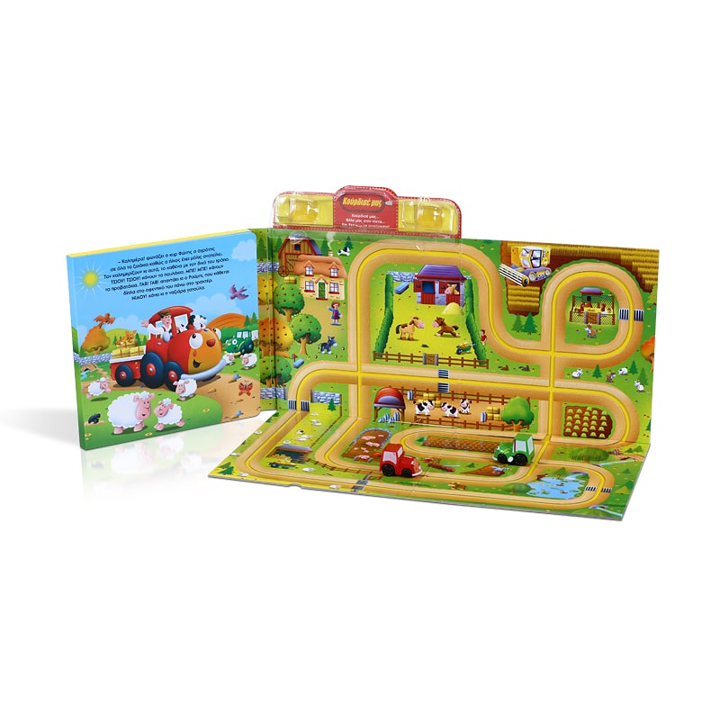Ακολούθησε τον κυρ Φώτη τον αγρότη στο αγρόκτημα και δες όλες τις δουλειές που έχει να κάνει σήμερα. Για περισσότερη διασκέδαση, κούρδισε τα δικά σου τρακτέρ, βάλ’ τα στην πίστα μέσα στο βιβλίο και παρακολούθησε τα να κινούνται!