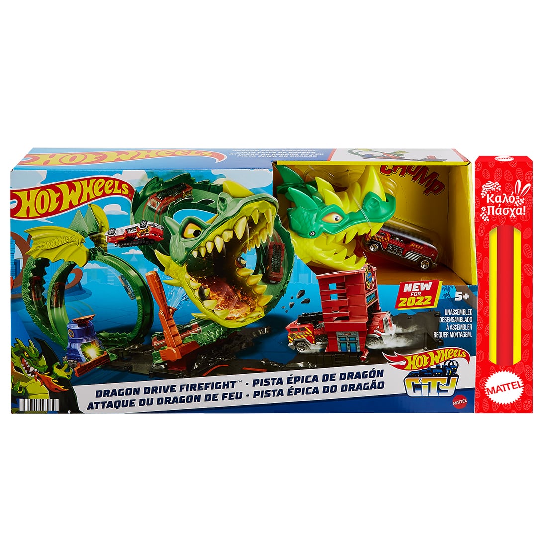 Πρόσεχε! Ένας μοχθηρός δράκος που ονομάζεται Δάντης επιτίθεται στον πυροσβεστικό σταθμό Hot Wheels™ City! Το αυτοκίνητο περνάει μέσα από το σώμα του, όπου τα παιδιά χρησιμοποιούν τις δεξιότητές τους για να τα εκτοξεύσουν από το κεφάλι του δράκου για να τον χτυπήσουν έξω. Αυτό το σετ διαθέτει λουπ 360 μοιρών και συνδέεται με άλλα σετ και κομμάτια Hot Wheels™ City για εκτεταμένες δυνατότητες αφήγησης. Δώρο, απίθανη Λαμπάδα!