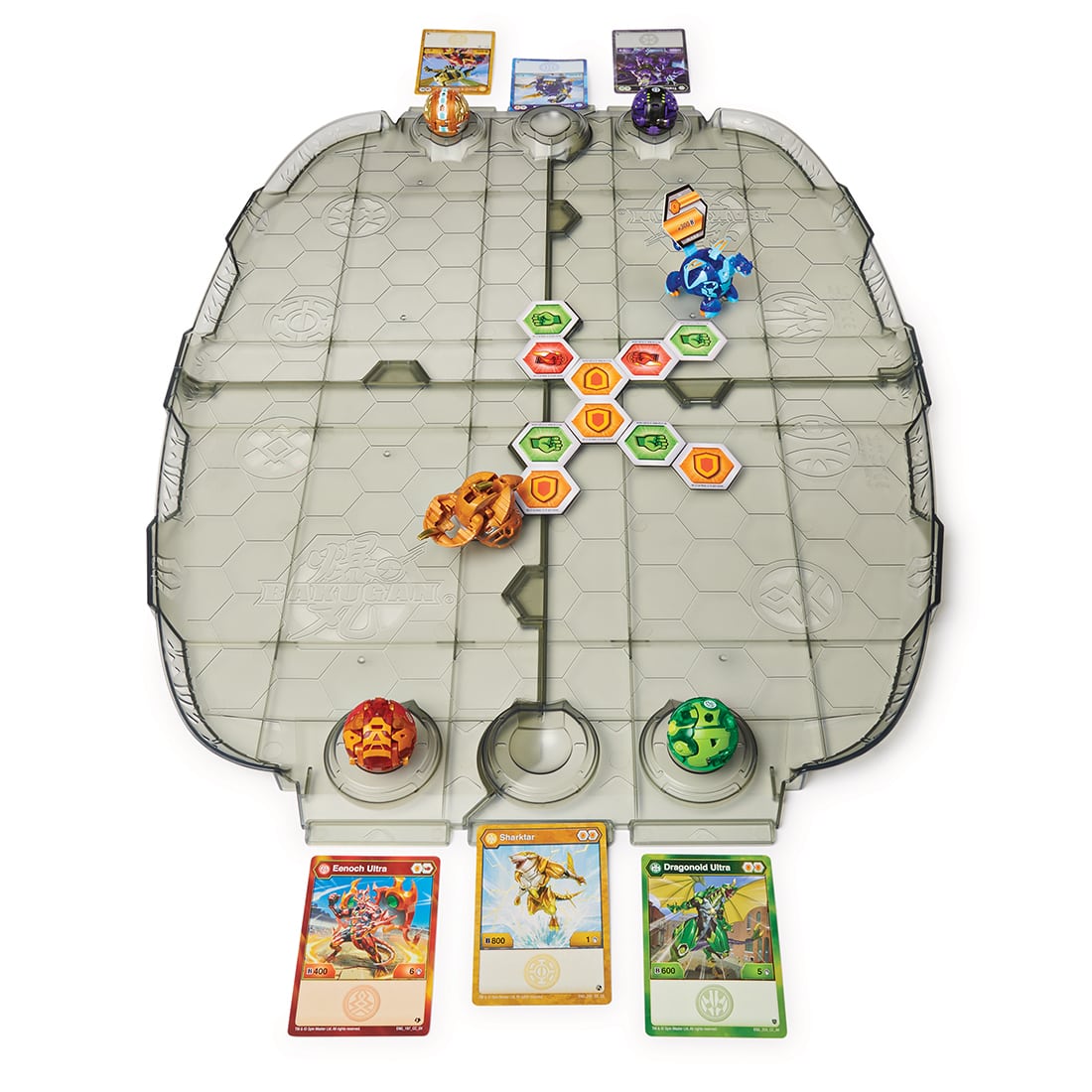 Μονομαχίες για αληθινούς πρωταθλητές στην Πίστα Μάχης Bakugan! Με τον Σάρκταρ σε αποκλειστική χρυσή έκδοση Bakugan, εντυπωσιακή ανθεκτική επιφάνεια μάχης, υπερυψωμένο περιμετρικό τείχος και βάσεις για να τοποθετείς το Bakugan σου μέχρι να είσαι έτοιμος για μάχη – αυτή η επική αρένα είναι ο απόλυτος χώρος για κόντρες! Διαθέτει εξαγωνικό σχέδιο πάνω στο ταμπλό, για να στήνεις εύκολα τις κάρτες BakuCore (συμπεριλαμβάνονται δύο) και να ξεκινάς αμέσως τη μάχη. Αντιμετώπισε όλους τους αντιπάλους και μεταμόρφωσε το αποκλειστικό Bakugan κυλώντας τον Σάρκταρ πάνω στη ράμπα και μέσα στην πίστα μάχης! Το υπερυψωμένο περιμετρικό τείχος κρατάει τις κόντρες μέσα στα όρια Πίστας Μάχης και λειτουργεί ως βάση για απίθανα κόλπα. Αποθήκευσε τις κάρτες σου στις ειδικές σχισμές και κράτα τα πάντα υπό έλεγχο στη διάρκεια της μάχης. Και τώρα, μπορείς να δώσεις στις κόντρες σου νέο αέρα με τα Geogan (καθένα πωλείται ξεχωριστά): τρία καινούργια Bakugan έκπληξη, με νέα σχήματα και μοναδικές μεταμορφώσεις για ακόμα μεγαλύτερη δύναμη μάχης! Η Πίστα Μάχης κάνει τις κόντρες ακόμα πιο ζωντανές και απογειώνει τη συλλογή σου. Απόκτησε την Πίσατ Μάχης Bakugan και ζήσε όλη την αγωνία και τον ενθουσιασμό της μονομαχίας! Δώρο, απίθανη Λαμπάδα!