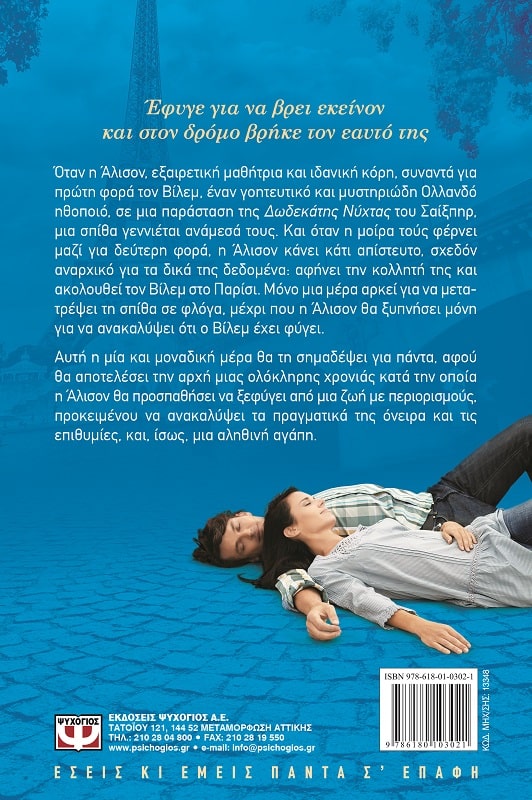 Όταν η Άλισον, εξαιρετική μαθήτρια και ιδανική κόρη, συναντά για πρώτη φορά τον Βίλεμ, έναν γοητευτικό και μυστηριώδη Ολλανδό ηθοποιό, σε μια παράσταση της Δωδέκατης Νύχτας του Σαίξπηρ, μια σπίθα γεννιέται ανάμεσά τους. Και όταν η μοίρα τούς φέρνει μαζί για δεύτερη φορά, η Άλισον κάνει κάτι απίστευτο, σχεδόν αναρχικό για τα δικά της δεδομένα: αφήνει την κολλητή της και ακολουθεί τον Βίλεμ στο Παρίσι. Μόνο μια μέρα αρκεί για να μετατρέψει τη σπίθα σε φλόγα, μέχρι που η Άλισον θα ξυπνήσει μόνη για να ανακαλύψει ότι ο Βίλεμ έχει φύγει.