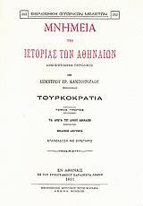 [set τριών τόμων]Ο ιστοριοδίφης, λογοτέχνης (ποιητής, θεατρικός συγγραφέας και διηγηματογράφος) και Ακαδημαϊκός Δημήτριος Καμπούρογλου (1852-1942) ήταν ο κατεξοχήν "Αθηναιογράφος". Τα τρίτομα "Μνημεία της ιστορίας των Αθηναίων", μαζί με την επίσης τρίτομη "Ιστορία των Αθηναίων" (1889-1896), αποτέλεσαν τον πυρήνα της ιστορικής του έρευνας γύρω από την Αθήνα. Πρόκειται για συλλογή πηγών, πρωτογενών και δευτερογενών, της Αθηναϊκής ιστορίας την περίοδο της Τουρκοκρατίας και της Επανάστασης: μονογραφίες, άρθρα, ανακοινώσεις, χρονογραφίες, αποσπάσματα περιηγητών, βιογραφικά, γενεαλογικά και αγιολογικά σημειώματα, επιγραφές, επιτύμβια επιγράμματα, ενθυμήσεις επί βιβλίων, μολυβδόβουλα και σφραγίδες, λαογραφικό και φιλολογικό υλικό (ήθη, έθιμα, προλήψεις, δεισιδαιμονίες, δημοτικά τραγούδια, παραμύθια, αινίγματα, παροιμίες κτλ.) καθώς και πλείστα ανέκδοτα ιστορικά τεκμήρια (προικοσύμφωνα, πωλητήρια και άλλα συμβολαιογραφικά έγγραφα, σιγγίλια [πατριαρχικές επιστολές], πράξεις εκλογής δημογερόντων, φιρμάνια, χοτζέτια και οθωμανικοί τίτλοι ιδιοκτησίας κτλ.). Ο Καμπούρογλου τονίζει στον πρόλογό του ότι φιλοδοξία του ήταν να συλλέξει "πάσαν ιστορικήν ύλην" για τη διευκόλυνση του δύσκολου έργου των μελλοντικών ερευνητών. Τα Μνημεία αποτελούν σίγουρα πολύτιμη ιστορική ύλη και αντλήθηκαν κυρίως από τις πλούσιες συλλογές παλαιών βιβλίων και χειρογράφων της Εθνικής Βιβλιοθήκης, της οποίας ο Καμπούρογλου χρημάτισε διευθυντής την περίοδο 1904-17. Η αναστατική έκδοση περιλαμβάνει αναλυτικό ευρετήριο κυρίων ονομάτων και τόπων, που συνέταξε ο Αλέξανδρος Πανούσης.