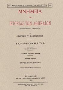 [set τριών τόμων]Ο ιστοριοδίφης, λογοτέχνης (ποιητής, θεατρικός συγγραφέας και διηγηματογράφος) και Ακαδημαϊκός Δημήτριος Καμπούρογλου (1852-1942) ήταν ο κατεξοχήν "Αθηναιογράφος". Τα τρίτομα "Μνημεία της ιστορίας των Αθηναίων", μαζί με την επίσης τρίτομη "Ιστορία των Αθηναίων" (1889-1896), αποτέλεσαν τον πυρήνα της ιστορικής του έρευνας γύρω από την Αθήνα. Πρόκειται για συλλογή πηγών, πρωτογενών και δευτερογενών, της Αθηναϊκής ιστορίας την περίοδο της Τουρκοκρατίας και της Επανάστασης: μονογραφίες, άρθρα, ανακοινώσεις, χρονογραφίες, αποσπάσματα περιηγητών, βιογραφικά, γενεαλογικά και αγιολογικά σημειώματα, επιγραφές, επιτύμβια επιγράμματα, ενθυμήσεις επί βιβλίων, μολυβδόβουλα και σφραγίδες, λαογραφικό και φιλολογικό υλικό (ήθη, έθιμα, προλήψεις, δεισιδαιμονίες, δημοτικά τραγούδια, παραμύθια, αινίγματα, παροιμίες κτλ.) καθώς και πλείστα ανέκδοτα ιστορικά τεκμήρια (προικοσύμφωνα, πωλητήρια και άλλα συμβολαιογραφικά έγγραφα, σιγγίλια [πατριαρχικές επιστολές], πράξεις εκλογής δημογερόντων, φιρμάνια, χοτζέτια και οθωμανικοί τίτλοι ιδιοκτησίας κτλ.). Ο Καμπούρογλου τονίζει στον πρόλογό του ότι φιλοδοξία του ήταν να συλλέξει "πάσαν ιστορικήν ύλην" για τη διευκόλυνση του δύσκολου έργου των μελλοντικών ερευνητών. Τα Μνημεία αποτελούν σίγουρα πολύτιμη ιστορική ύλη και αντλήθηκαν κυρίως από τις πλούσιες συλλογές παλαιών βιβλίων και χειρογράφων της Εθνικής Βιβλιοθήκης, της οποίας ο Καμπούρογλου χρημάτισε διευθυντής την περίοδο 1904-17. Η αναστατική έκδοση περιλαμβάνει αναλυτικό ευρετήριο κυρίων ονομάτων και τόπων, που συνέταξε ο Αλέξανδρος Πανούσης.