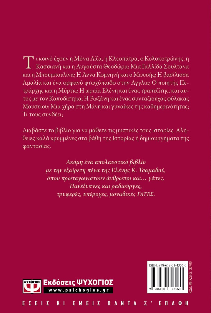 Ακόμη ένα απολαυστικό βιβλίο με την εξαίρετη πένα της Ελένης Κ. Τσαμαδού, όπου πρωταγωνιστούν άνθρωποι και… γάτες. Πανέξυπνες και ραδιούργες, τρυφερές, υπέροχες, μοναδικές ΓΑΤΕΣ.