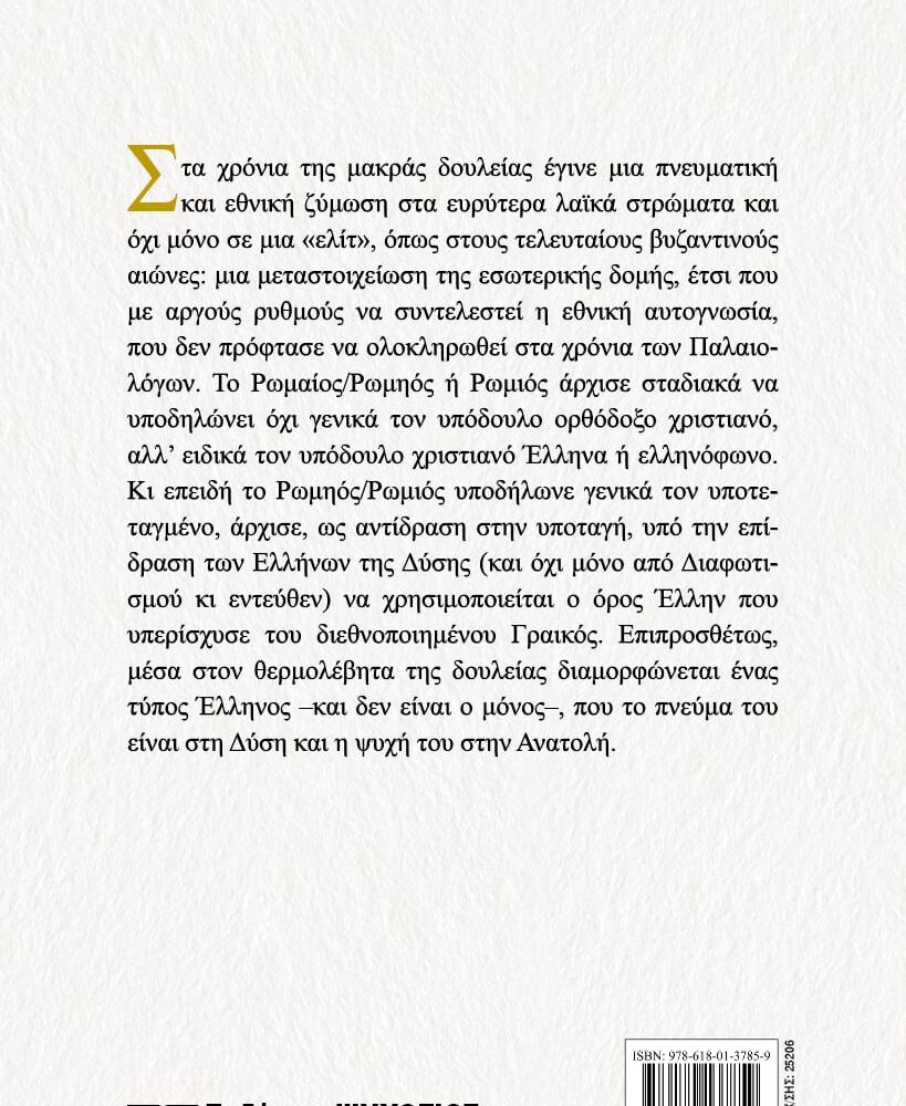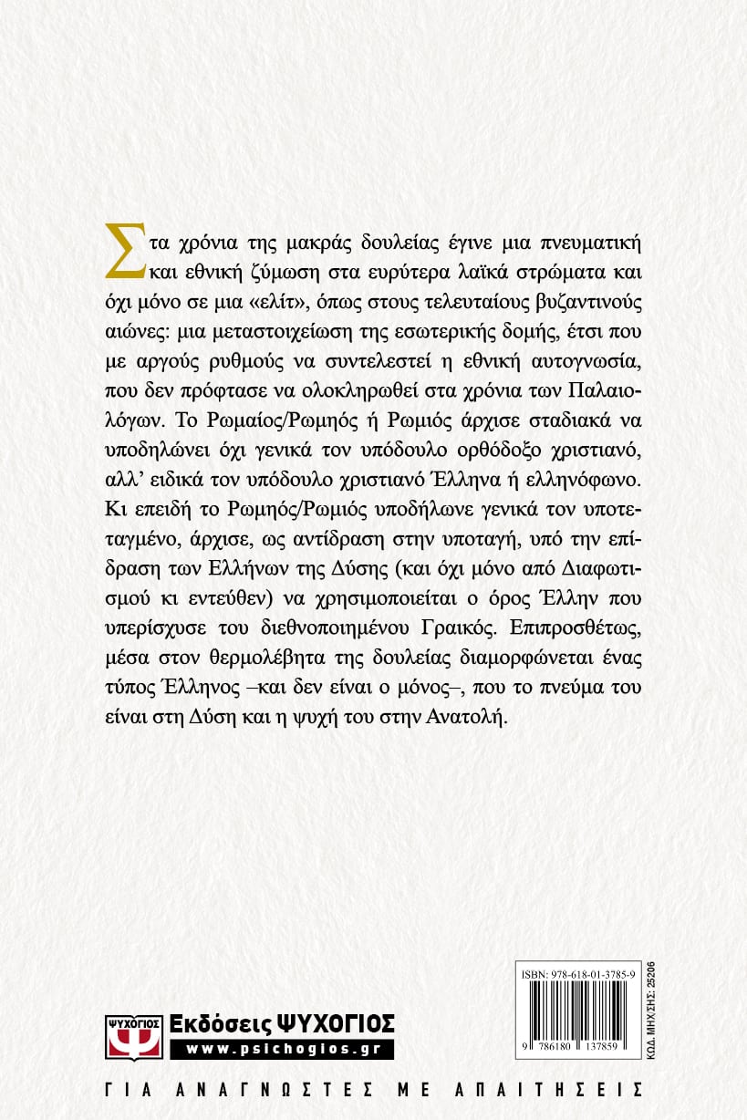 Στα χρόνια της μακράς δουλείας έγινε μια πνευματική και εθνική ζύμωση στα ευρύτερα λαϊκά στρώματα και όχι μόνο σε μια «ελίτ», όπως στους τελευταίους βυζαντινούς αιώνες: μια μεταστοιχείωση της εσωτερικής δομής, έτσι που με αργούς ρυθμούς να συντελεστεί η εθνική αυτογνωσία, που δεν πρόφτασε να ολοκληρωθεί στα χρόνια των Παλαιολόγων. Το Ρωμαίος/Ρωμηός ή Ρωμιός άρχισε σταδιακά να υποδηλώνει όχι γενικά τον υπόδουλο ορθόδοξο χριστιανό, αλλ’ ειδικά τον υπόδουλο χριστιανό Έλληνα ή ελληνόφωνο. Κι επειδή το Ρωμηός/Ρωμιός υποδήλωνε γενικά τον υποτεταγμένο, άρχισε, ως αντίδραση στην υποταγή, υπό την επίδραση των Ελλήνων της Δύσης (και όχι μόνο από Διαφωτισμού κι εντεύθεν) να χρησιμοποιείται ο όρος Έλλην που υπερίσχυσε του διεθνοποιημένου Γραικός. Επιπροσθέτως, μέσα στον θερμολέβητα της δουλείας διαμορφώνεται ένας τύπος Έλληνος –και δεν είναι ο μόνος–, που το πνεύμα του είναι στη Δύση και η ψυχή του στην Ανατολή.