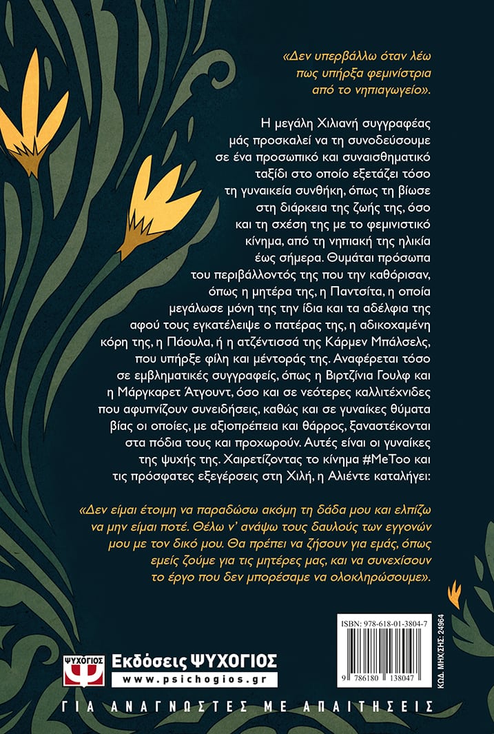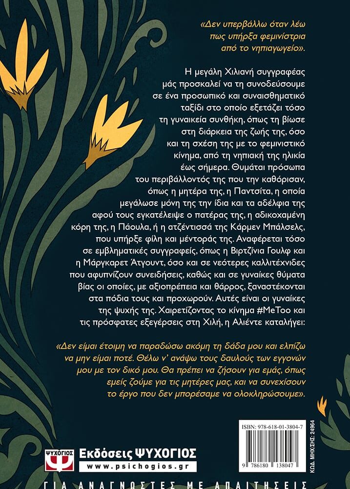Η μεγάλη Χιλιανή συγγραφέας μάς προσκαλεί να τη συνοδεύσουμε σε ένα προσωπικό και συναισθηματικό ταξίδι στο οποίο εξετάζει τόσο τη γυναικεία συνθήκη, όπως τη βίωσε στη διάρκεια της ζωής της, όσο και τη σχέση της με το φεμινιστικό κίνημα, από τη νηπιακή της ηλικία έως σήμερα. Θυμάται πρόσωπα του περιβάλλοντός της που την καθόρισαν, όπως η μητέρα της, η Παντσίτα, η οποία μεγάλωσε μόνη της την ίδια και τα αδέλφια της αφού τους εγκατέλειψε ο πατέρας της, η αδικοχαμένη κόρη της, η Πάουλα, ή η ατζέντισσά της Κάρμεν Μπάλσελς, που υπήρξε φίλη και μέντοράς της. Αναφέρεται τόσο σε εμβληματικές συγγραφείς, όπως η Βιρτζίνια Γουλφ και η Μάργκαρετ Άτγουντ, όσο και σε νεότερες καλλιτέχνιδες που αφυπνίζουν συνειδήσεις, καθώς και σε γυναίκες θύματα βίας οι οποίες, με αξιοπρέπεια και θάρρος, ξαναστέκονται στα πόδια τους και προχωρούν. Αυτές είναι οι γυναίκες της ψυχής της. Χαιρετίζοντας το κίνημα #MeToo και τις πρόσφατες εξεγέρσεις στη Χιλή, η Αλιέντε καταλήγει: