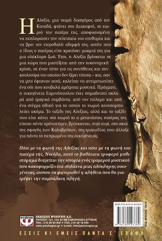 Η Αλεξία, μια νεαρή δικηγόρος από τον Καναδά, φτάνει στο Διακοφτό, το χωριό του πατέρα της, αποφασισμένη να εκπληρώσει την τελευταία του επιθυμία και να βρει την ετεροθαλή αδερφή της, αυτήν που ο ίδιος ο πατέρας είχε κρατήσει μακριά της για μια ολόκληρη ζωή. Έτσι, η Αλεξία βρίσκεται σε μια χώρα που μαστίζεται από την οικονομική κρίση, σε έναν τόπο για τις συνήθειες και την κουλτούρα του οποίου δεν ξέρει τίποτα – και, σαν να μην έφταναν αυτά, καλείται να αντιμετωπίσει ένα σόι που κουβαλά αμέτρητα μυστικά. Πράγματι, η οικογένεια Σαρινόπουλου έχει σημαδευτεί σκληρά από τραγικά συμβάντα, από τον πόλεμο και από ένα στίγμα ηθικό για το οποίο το χωριό κουτσομπολεύει ακόμα. Το ταξίδι της Αλεξίας, αλλά και το ταξίδι που είχε κάνει στο χωριό κι ο μετανάστης πατέρας της είκοσι πέντε χρόνια πριν, βρίσκονται, σιγά σιγά, στη σκιά της σφαγής των Καλαβρύτων, της τραγωδίας που άλλαξε για πάντα το πεπρωμένο της οικογένειας.