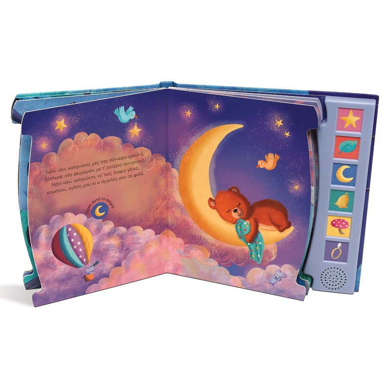 Ακούστε αγκαλιά με το μικρό σας τις όμορφες μελωδίες που πλημμυρίζουν τις τρυφερές εικόνες του βιβλίου και διαβάστε τα ρυθμικά στιχάκια για μια γλυκιά καληνύχτα.
