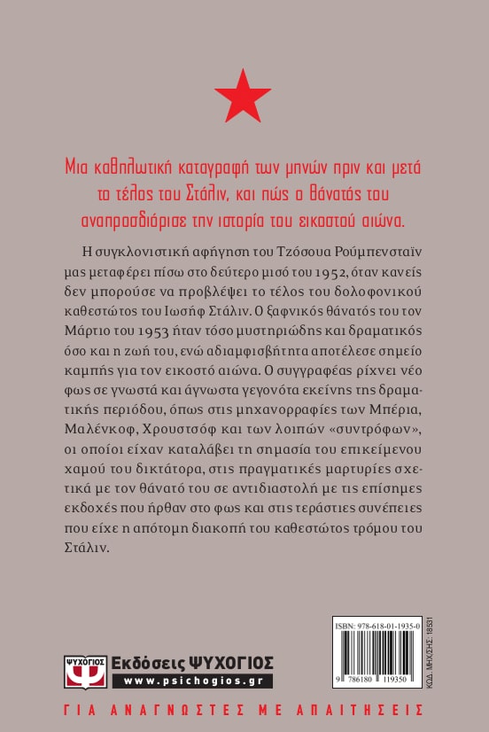 H συγκλονιστική αφήγηση του Τζόσουα Ρούμπενσταϊν μας μεταφέρει πίσω στο δεύτερο μισό του 1952, όταν κανείς δεν μπορούσε να προβλέψει το τέλος του εγκληματικού καθεστώτος του Iωσήφ Στάλιν. Ο ξαφνικός θάνατός του τον Mάρτιο του 1953 ήταν τόσο μυστηριώδης και δραματικός όσο και η ζωή του, ενώ αδιαμφισβήτητα αποτέλεσε σημείο καμπής για τον εικοστό αιώνα. Ο συγγραφέας ρίχνει νέο φως σε γνωστά και άγνωστα γεγονότα εκείνης της καθοριστικής περιόδου, όπως στις μηχανορραφίες των Mπέρια, Mαλένκοφ, Χρουστσόφ και των λοιπών «συντρόφων»,