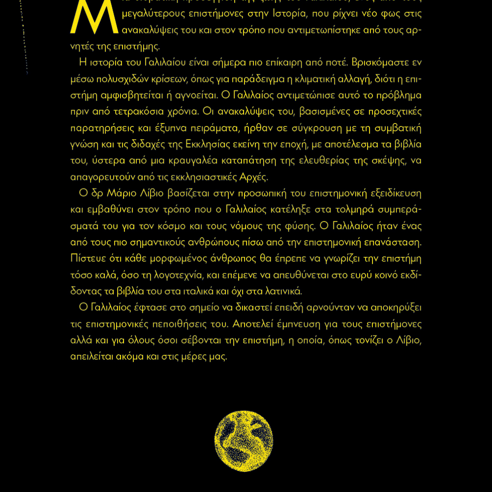 Ο δρ Μάριο Λίβιο βασίζεται στην προσωπική του επιστημονική εξειδίκευση και εμβαθύνει στον τρόπο που ο Γαλιλαίος κατέληξε στα τολμηρά συμπεράσματά του για τον κόσμο και τους νόμους της φύσης. Ο Γαλιλαίος ήταν ένας από τους πιο σημαντικούς ανθρώπους πίσω από την επιστημονική επανάσταση. Πίστευε ότι κάθε μορφωμένος άνθρωπος θα έπρεπε να γνωρίζει την επιστήμη τόσο καλά, όσο τη λογοτεχνία, και επέμενε να απευθύνεται στο ευρύ κοινό εκδίδοντας τα βιβλία του στα ιταλικά και όχι στα λατινικά.