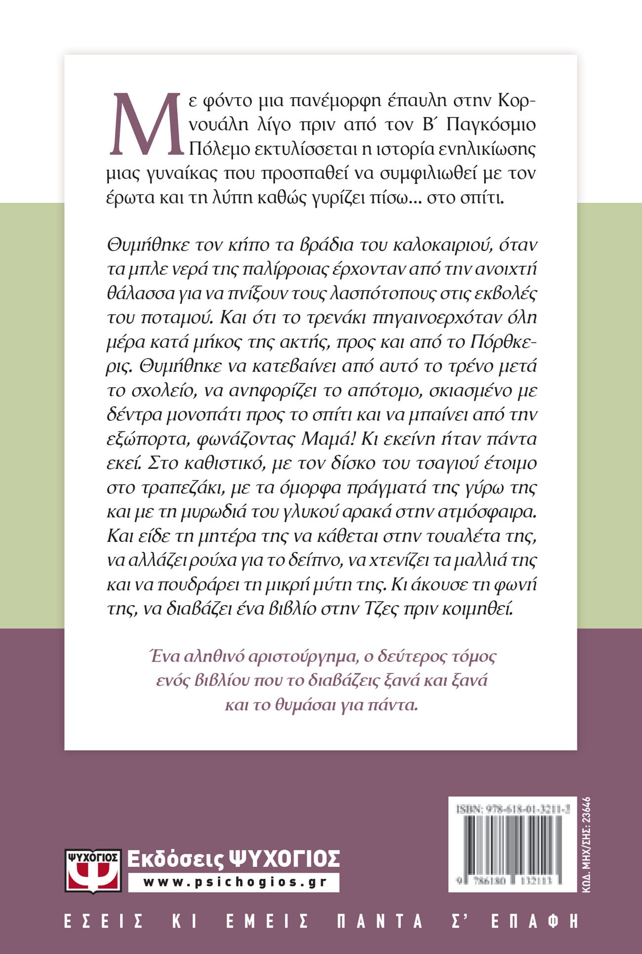 Θυμήθηκε τον κήπο τα βράδια του καλοκαιριού, όταν τα μπλε νερά της παλίρροιας έρχονταν από την ανοιχτή θάλασσα για να πνίξουν τους λασπότοπους στις εκβολές του ποταμού. Και ότι το τρενάκι πηγαινοερχόταν όλη μέρα κατά μήκος της ακτής, προς και από το Πόρθκερις. Θυμήθηκε να κατεβαίνει από αυτό το τρένο μετά το σχολείο, να ανηφορίζει το απότομο, σκιασμένο με δέντρα μονοπάτι προς το σπίτι και να μπαίνει από την εξώπορτα, φωνάζοντας Μαμά! Κι εκείνη ήταν πάντα εκεί. Στο καθιστικό, με τον δίσκο του τσαγιού έτοιμο στο τραπεζάκι, με τα όμορφα πράγματά της γύρω της και με τη μυρωδιά του γλυκού αρακά στην ατμόσφαιρα. Και είδε τη μητέρα της να κάθεται στην τουαλέτα της, να αλλάζει ρούχα για το δείπνο, να χτενίζει τα μαλλιά της και να πουδράρει τη μικρή μύτη της. Κι άκουσε τη φωνή της, να διαβάζει ένα βιβλίο στην Τζες πριν κοιμηθεί.