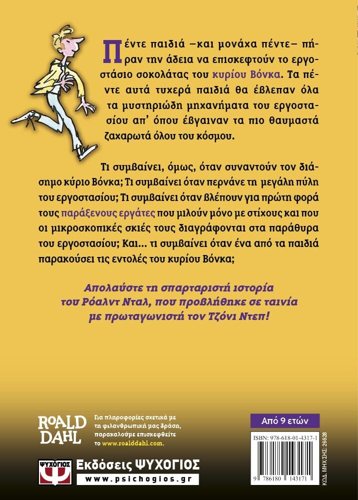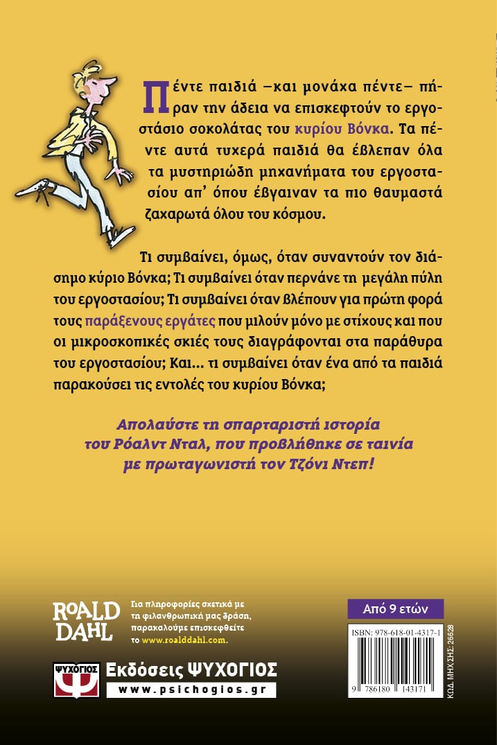 Περιπέτεια γεμάτη σοκολάτα. Πέντε παιδιά –και μονάχα πέντε– πήραν την άδεια να επισκεφτούν το εργοστάσιο σοκολάτας του κυρίου Βόνκα. Τα πέντε αυτά τυχερά παιδιά θα έβλεπαν όλα τα μυστηριώδη μηχανήματα του εργοστασίου απ’ όπου έβγαιναν τα πιο θαυμαστά ζαχαρωτά όλου του κόσμου. Τι συμβαίνει όμως όταν συναντούν τον διάσημο κύριο Βόνκα; Τι συμβαίνει όταν περνάνε τη μεγάλη πύλη του εργοστασίου; Τι συμβαίνει όταν βλέπουν για πρώτη φορά τους παράξενους εργάτες που μιλούν μόνο με στίχους και που οι μικροσκοπικές σκιές τους διαγράφονται στα παράθυρα του εργοστασίου; Και… τι συμβαίνει όταν ένα από τα παιδιά παρακούσει τις εντολές του κυρίου Βόνκα; Αυτά, αγαπητέ αναγνώστη, θα τα μάθεις όταν διαβάσεις το σπαρταριστό παραμύθι του Ρόαλντ Νταλ.