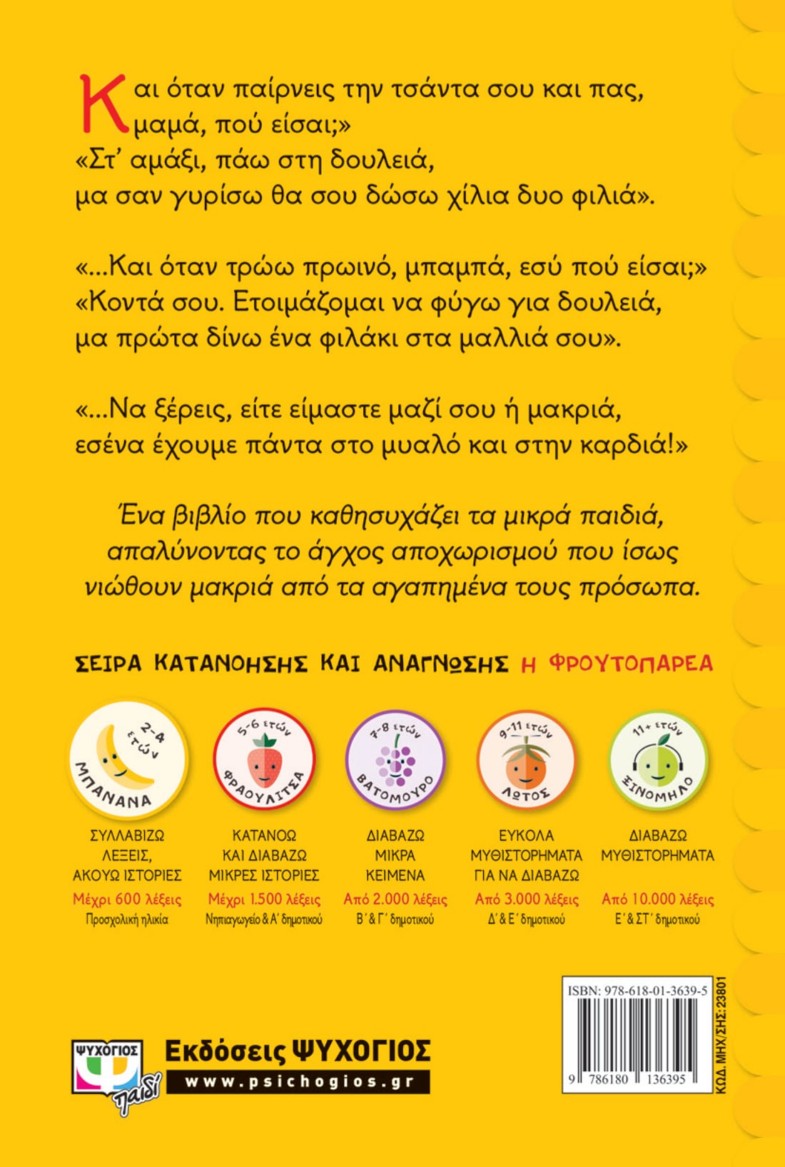 Ένα βιβλίο που καθησυχάζει τα μικρά παιδιά, απαλύνοντας το άγχος αποχωρισμού που ίσως νιώθουν μακριά από τα αγαπημένα τους πρόσωπα.