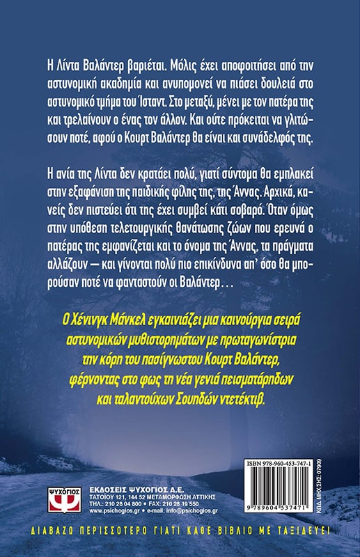 Ο Χένινγκ Μάνκελ εγκαινιάζει μια καινούργια σειρά αστυνομικών μυθιστορημάτων με πρωταγωνίστρια την κόρη του πασίγνωστου Κουρτ Βαλάντερ, φέρνοντας στο φως τη νέα γενιά πεισματάρηδων και ταλαντούχων Σουηδών ντετέκτιβ.