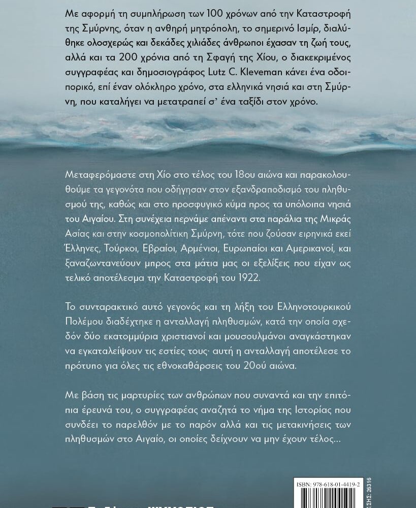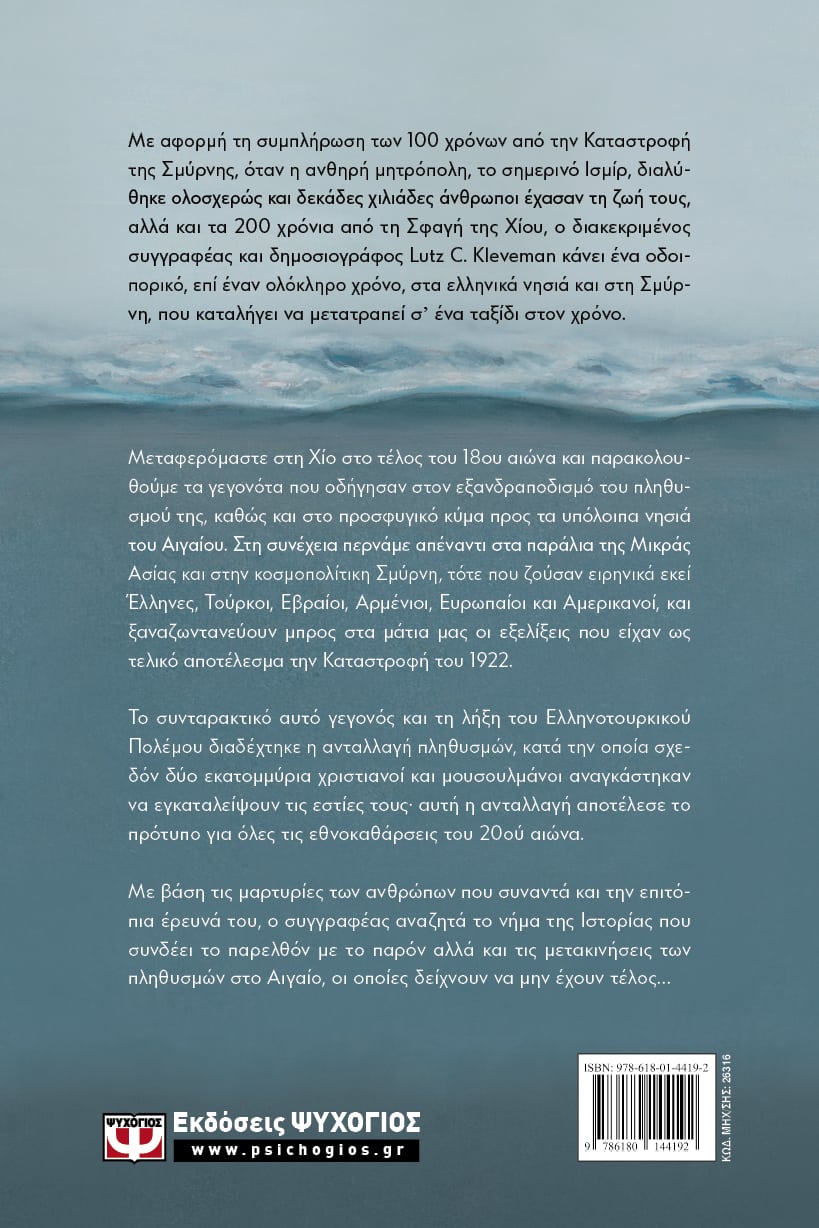 Με αφορμή τη συμπλήρωση των 100 χρόνων από την Καταστροφή της Σμύρνης, όταν η ανθηρή μητρόπολη, το σημερινό Ισμίρ, διαλύθηκε ολοσχερώς και δεκάδες χιλιάδες άνθρωποι έχασαν τη ζωή τους, αλλά και τα 200 χρόνια από τη Σφαγή της Χίου, ο διακεκριμένος συγγραφέας και δημοσιογράφος Lutz C. Kleveman κάνει ένα οδοιπορικό, επί έναν ολόκληρο χρόνο, στα ελληνικά νησιά και στη Σμύρνη, που καταλήγει να μετατραπεί σ’ ένα ταξίδι στον χρόνο.