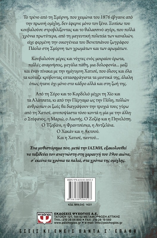 Το τρένο από τη Σμύρνη, που χειμώνα του 1876 έβγαινε από την πρωινή ομίχλη, δεν έφερνε μόνο τον ξένο. Ξοπίσω του κουβαλούσε στροβιλίζοντας και το θαλασσινό αγέρι, που πολλά χρόνια πρωτύτερα, από τη μαγευτική πολιτεία των καναλιών είχε φερμένη την οικογένεια του Βενετσιάνου ζωγράφου Πάολο στη Σμύρνη των χρωμάτων και των αρωμάτων.