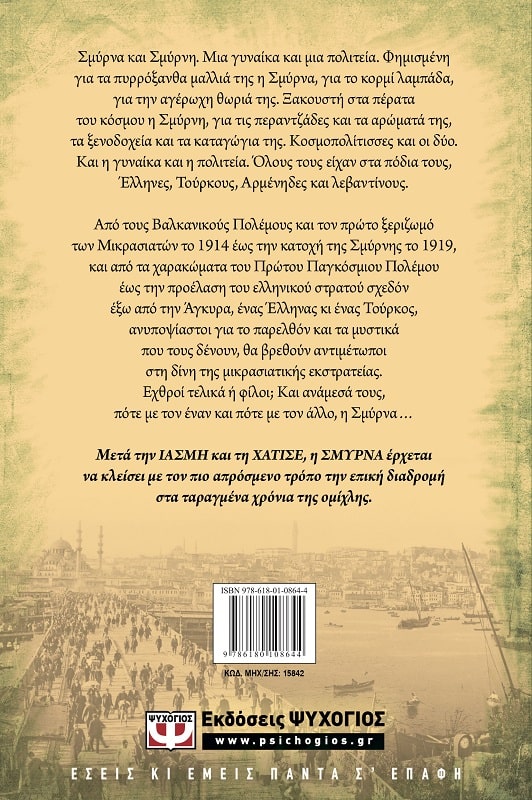 Σμύρνα και Σμύρνη. Μια γυναίκα και μια πολιτεία. Φημισμένη για τα πυρρόξανθα μαλλιά της η Σμύρνα, για το κορμί λαμπάδα, για την αγέρωχη θωριά της. Ξακουστή στα πέρατα του κόσμου η Σμύρνη, για τις περαντζάδες και τα αρώματά της, τα ξενοδοχεία και τα καταγώγια της,. Κοσμοπολίτισσες και οι δύο. Και η γυναίκα και η πολιτεία. Όλους τους είχαν στα πόδια τους, Έλληνες, Τούρκους, Αρμένηδες και λεβαντίνους.