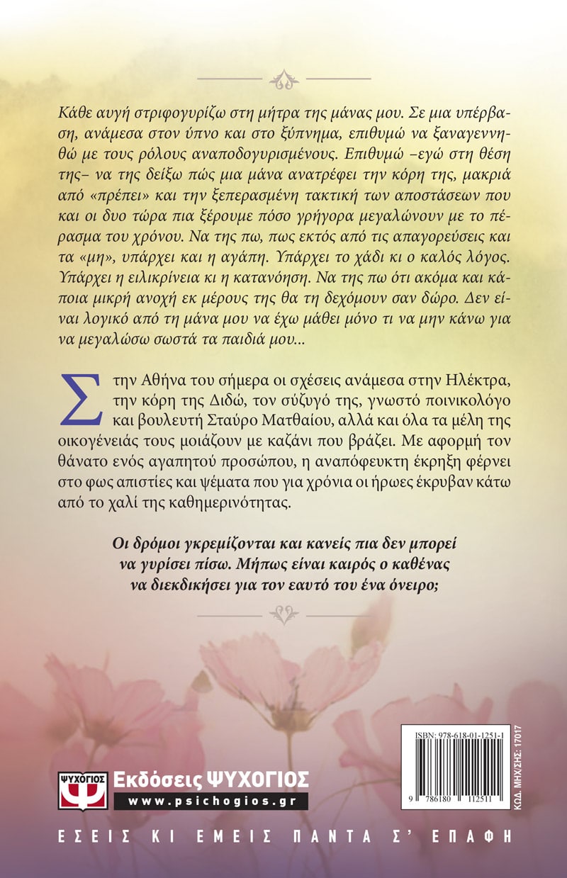 Κάθε αυγή στριφογυρίζω στη μήτρα της μάνας μου. Σε μια υπέρβαση, ανάμεσα στον ύπνο και στο ξύπνημα, επιθυμώ να ξαναγεννηθώ με τους ρόλους αναποδογυρισμένους. Επιθυμώ -εγώ στη θέση της- να της δείξω πώς μια μάνα ανατρέφει την κόρη της, μακριά από «πρέπει» και την ξεπερασμένη τακτική των αποστάσεων που και οι δυο τώρα πια ξέρουμε πόσο γρήγορα μεγαλώνουν με το πέρασμα του χρόνου. Να της πω πως εκτός από τις απαγορεύσεις και τα «μη», υπάρχει και η αγάπη. Υπάρχει το χάδι κι ο καλός λόγος. Υπάρχει η ειλικρίνεια κι η κατανόηση. Να της πω ότι ακόμα και κάποια μικρή ανοχή εκ μέρους της θα τη δεχόμουν σαν δώρο. Δεν είναι λογικό από τη μάνα μου να έχω μάθει μόνο τι να μην κάνω για να μεγαλώσω σωστά τα παιδιά μου…