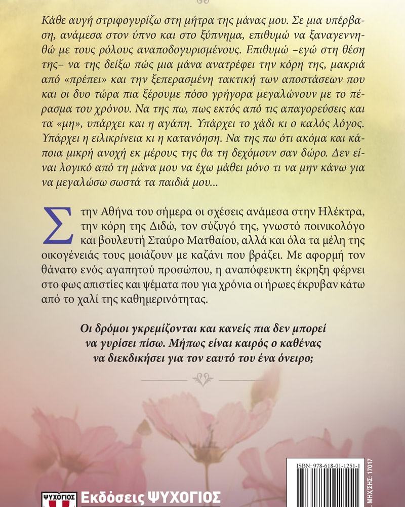 Κάθε αυγή στριφογυρίζω στη μήτρα της μάνας μου. Σε μια υπέρβαση, ανάμεσα στον ύπνο και στο ξύπνημα, επιθυμώ να ξαναγεννηθώ με τους ρόλους αναποδογυρισμένους. Επιθυμώ -εγώ στη θέση της- να της δείξω πώς μια μάνα ανατρέφει την κόρη της, μακριά από «πρέπει» και την ξεπερασμένη τακτική των αποστάσεων που και οι δυο τώρα πια ξέρουμε πόσο γρήγορα μεγαλώνουν με το πέρασμα του χρόνου. Να της πω πως εκτός από τις απαγορεύσεις και τα «μη», υπάρχει και η αγάπη. Υπάρχει το χάδι κι ο καλός λόγος. Υπάρχει η ειλικρίνεια κι η κατανόηση. Να της πω ότι ακόμα και κάποια μικρή ανοχή εκ μέρους της θα τη δεχόμουν σαν δώρο. Δεν είναι λογικό από τη μάνα μου να έχω μάθει μόνο τι να μην κάνω για να μεγαλώσω σωστά τα παιδιά μου…