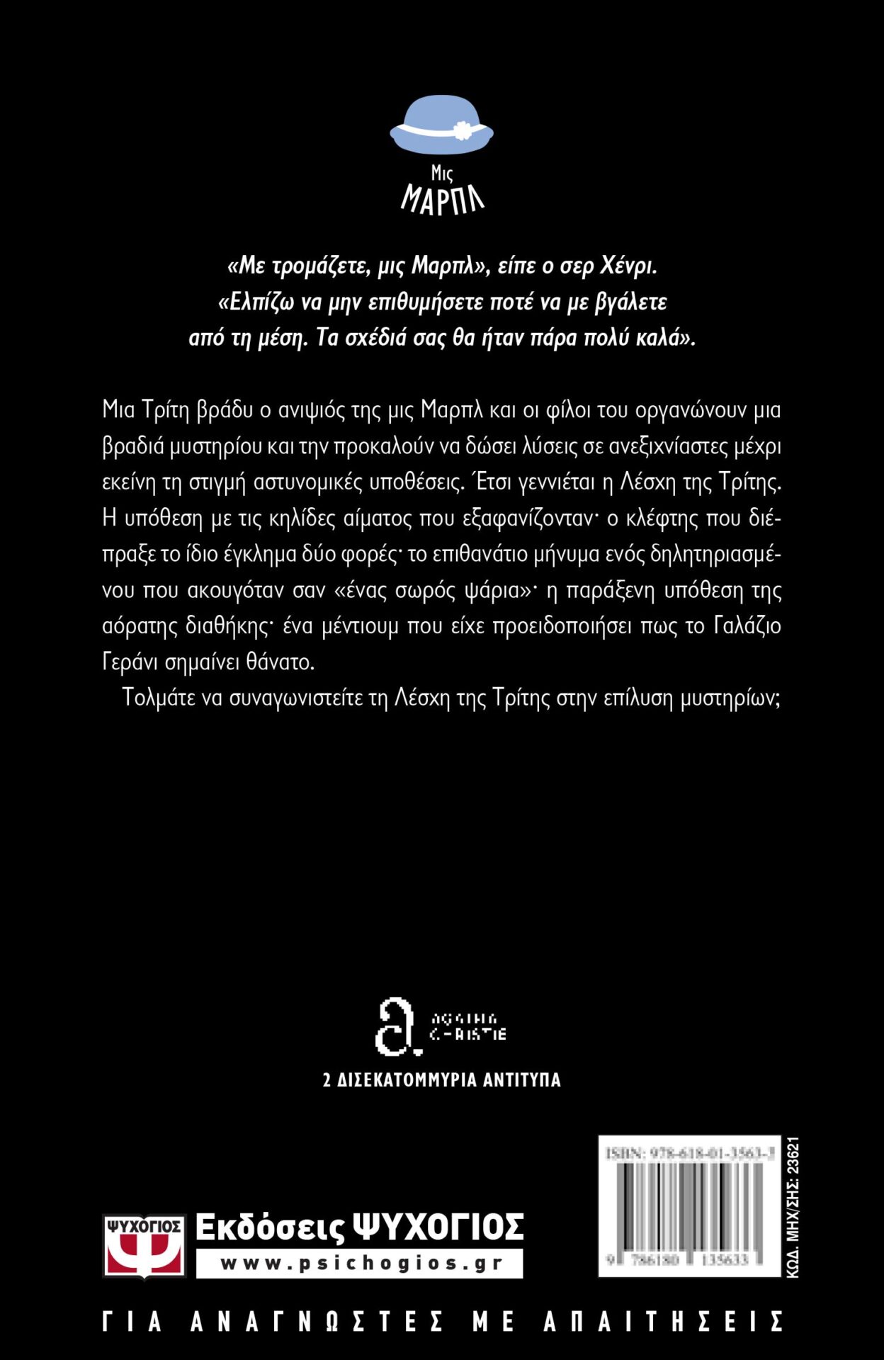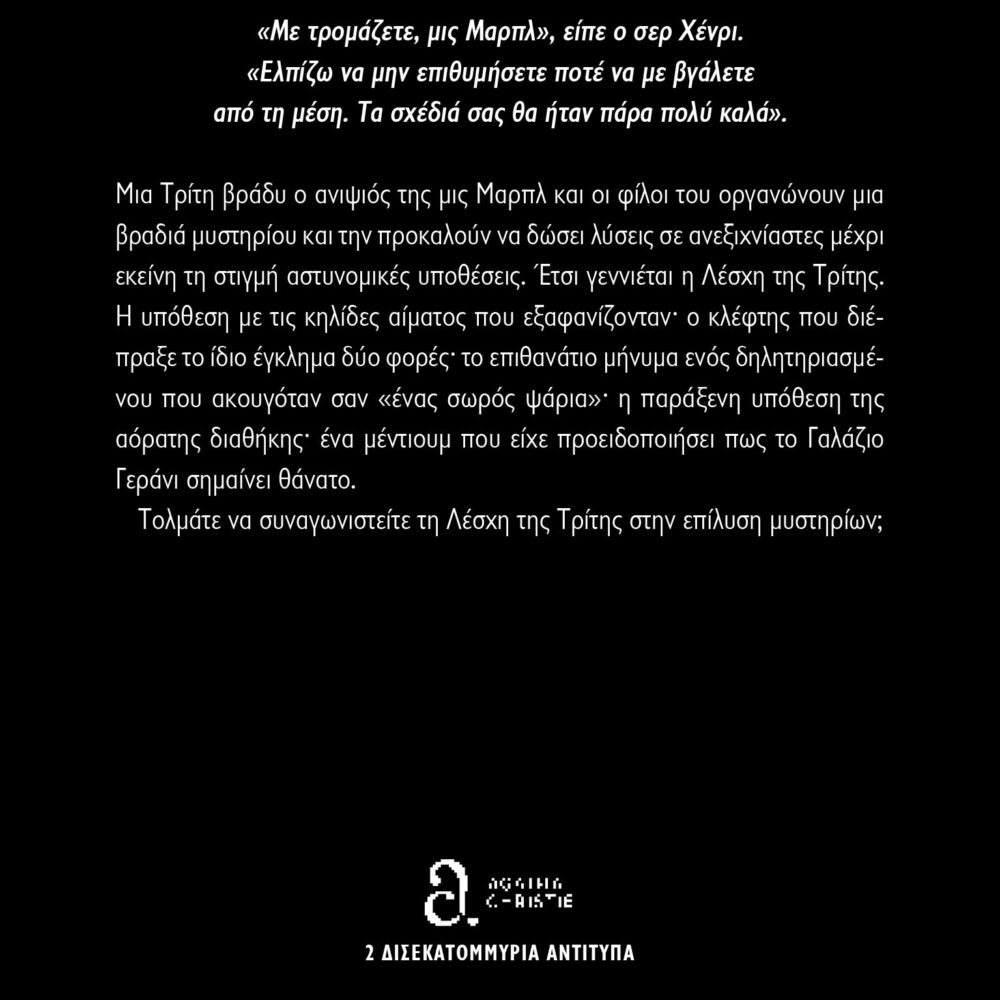 Μια Τρίτη βράδυ ο ανιψιός της μις Μαρπλ και οι φίλοι του οργανώνουν μια βραδιά μυστηρίου και την προκαλούν να δώσεις λύσεις σε ανεξιχνίαστες μέχρι εκείνη τη στιγμή αστυνομικές υποθέσεις. Έτσι γεννιέται η Λέσχη της Τρίτης. Η υπόθεση με τις κηλίδες αίματος που εξαφανίζονταν· ο κλέφτης που διέπραξε το ίδιο έγκλημα δύο φορές· το επιθανάτιο μήνυμα ενός δηλητηριασμένου που ακουγόταν σαν «ένας σωρός ψάρια»· η παράξενη υπόθεση της αόρατης διαθήκης· ένα μέντιουμ που είχε προειδοποιήσει πως το Γαλάζιο Γεράνι σημαίνει θάνατο.