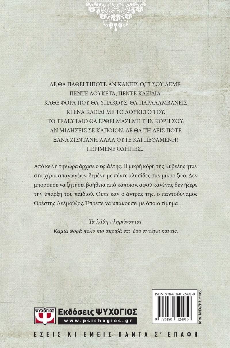 Από κείνη την ώρα άρχισε ο εφιάλτης. Η μικρή κόρη της Κυβέλης ήταν στα χέρια απαγωγέων, δεμένη με πέντε αλυσίδες σαν μικρό ζώο. Δεν μπορούσε να ζητήσει βοήθεια από κάποιον, αφού κανένας δεν ήξερε την ύπαρξη του παιδιού. Ούτε καν ο άντρας της, ο παντοδύναμος Ορέστης Δελμούζος. Έπρεπε να υπακούσει με όποιο τίμημα…