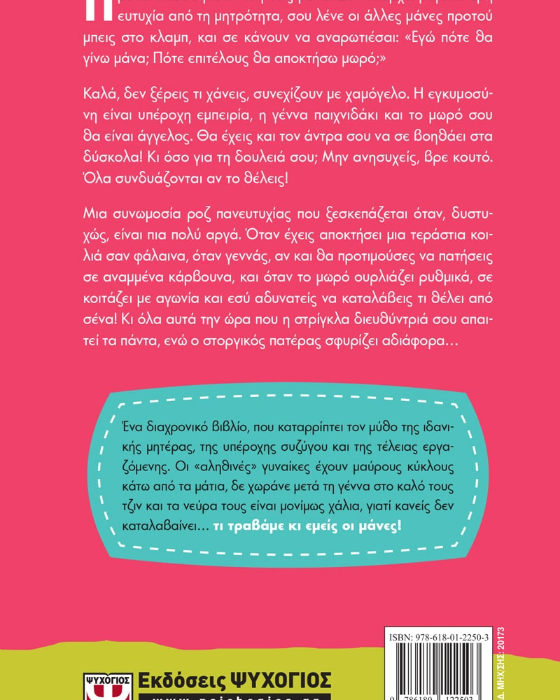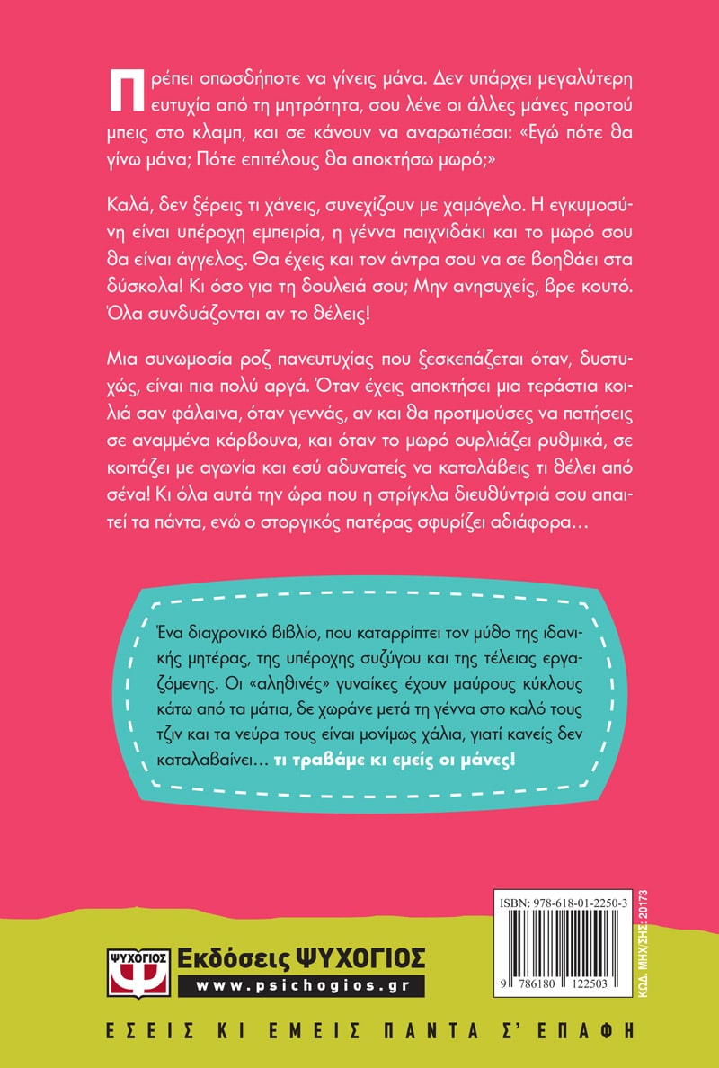 Ένα διαχρονικό βιβλίο, που καταρρίπτει τον μύθο της ιδανικής μητέρας, της υπέροχης συζύγου και της τέλειας εργαζόμενης. Οι «αληθινές» γυναίκες έχουν μαύρους κύκλους στα μάτια, δε χωράνε μετά τη γέννα στο καλό τους τζιν και τα νεύρα τους είναι μονίμως χάλια, γιατί κανείς δεν καταλαβαίνει… τι τραβάμε κι εμείς οι μάνες!