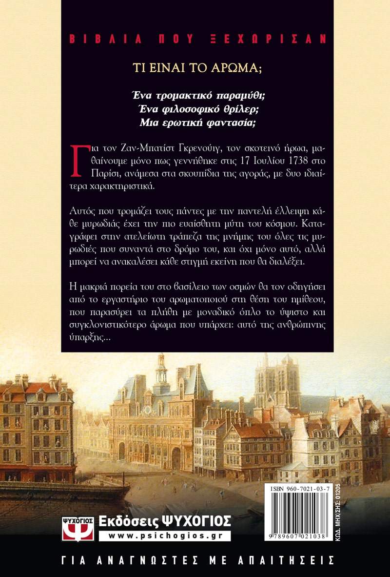 Ένα τρομακτικό παραμύθι; Ένα φιλοσοφικό θρίλερ; Μια ερωτική φαντασία; Για τον Ζαν-Μπατίστ Γκρενούιγ, τον σκοτεινό ήρωα, μαθαίνουμε μόνο πως γεννήθηκε στις 17 Ιουλίου 1738 στο Παρίσι, ανάμεσα στα σκουπίδια της αγοράς με δυο ιδιαίτερα χαρακτηριστικά. Αυτός που τρομάζει τους πάντες με την παντελή έλλειψη κάθε μυρωδιάς έχει την πιο ευαίσθητη μύτη του κόσμου. Καταγράφει στην ατελείωτη τράπεζα της μνήμης του όλες τις μυρωδιές που συναντά στο δρόμο του, και όχι μόνο αυτό, αλλά μπορεί να ανακαλέσει κάθε στιγμή εκείνη που θα διαλέξει. Η μακριά πορεία του στο βασίλειο των οσμών θα τον οδηγήσει από το εργαστήριο του αρωματοποιού στη θέση του ημίθεου που παρασύρει τα πλήθη με μοναδικό όπλο το ύψιστο και συγκλονιστικότερο άρωμα που υπάρχει. Αυτό της ανθρώπινης ύπαρξης.